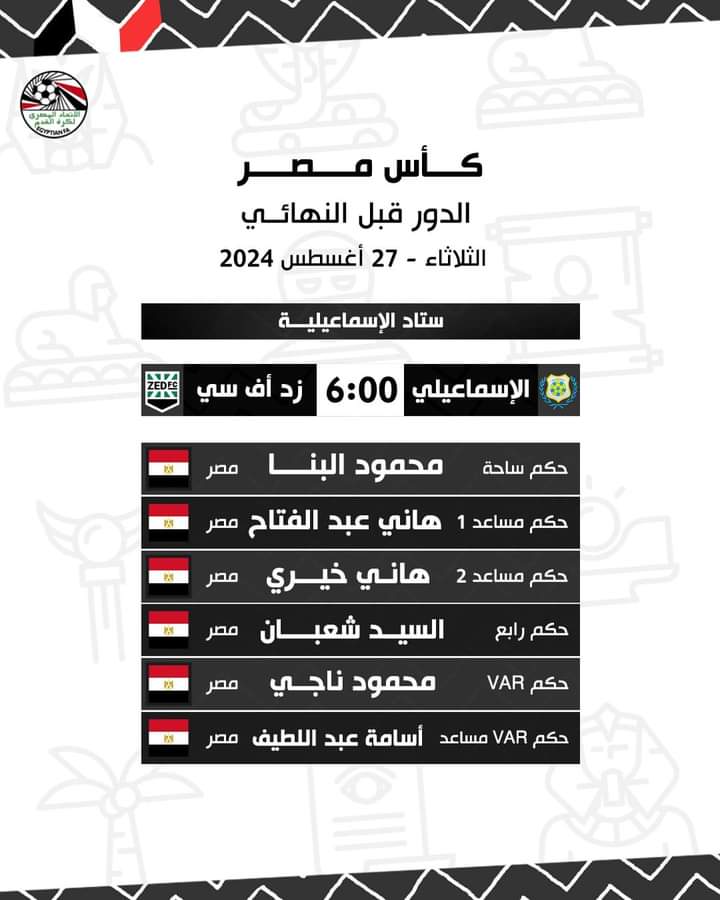 ويستضيف الإسماعيلي نظيره زد في تمام الساعة السادسة مساء غدا، تحت صافرة تحكيمية يقودها الحكم محمود البنا.