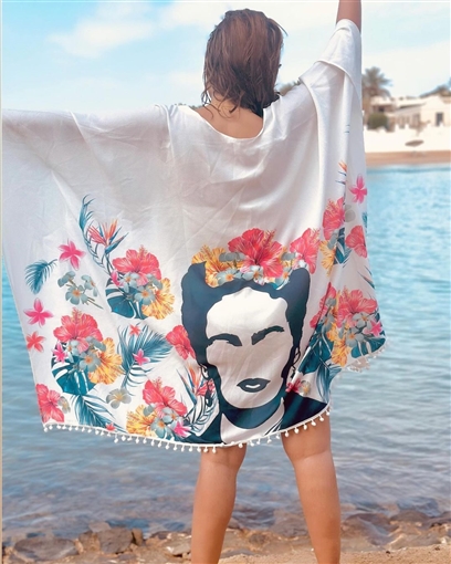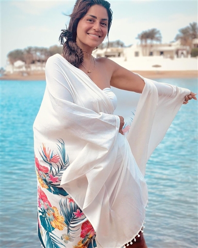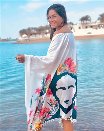 وظهرت منة فضالي ترتدي مايوه أبيض مع كاش مايوه أبيض شفاف مرسوم عليه الرسامة المكسيكية فرفريدا كاهلو.