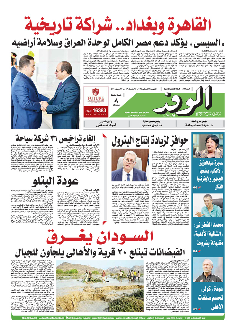 تنشر جريدة الوفد في عددها الصادر، غدًا الأربعاء العديد من الموضوعات والتقارير الإخبارية المهمة، أبرزها: “القاهرة وبغداد.. شراكة تاريخية".