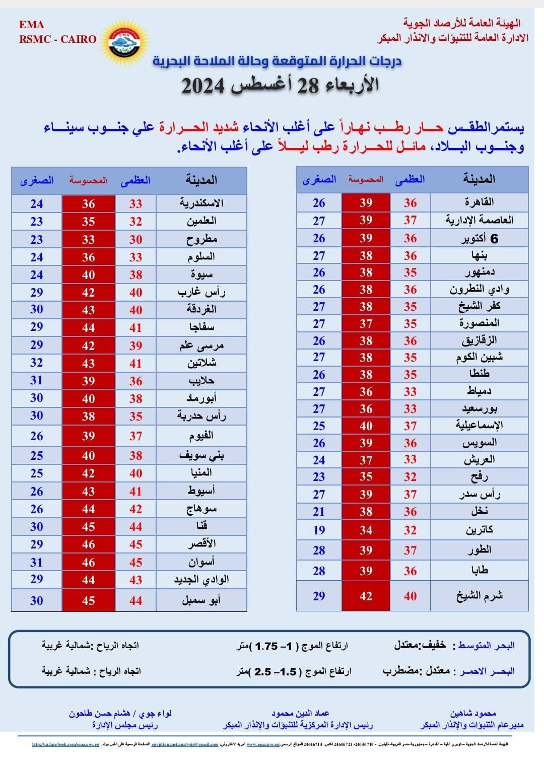 فيما يسود اليوم طقس حار رطب في فترة النهار على أغلب المحافظات، وشديد الحرارة على جنوب سيناء وجنوب البلاد ومائل للحرارة رطب في فترات الليل.