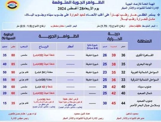جدير بالذكر يسود اليوم الأربعاء طقس حار رطب نهارًا على القاهرة الكبرى والوجه البحري والسواحل الشمالية، شديد الحرارة على جنوب البلاد، بينما يسود طقس مائل للحرارة رطب ليلا على أغلب الأنحاء.