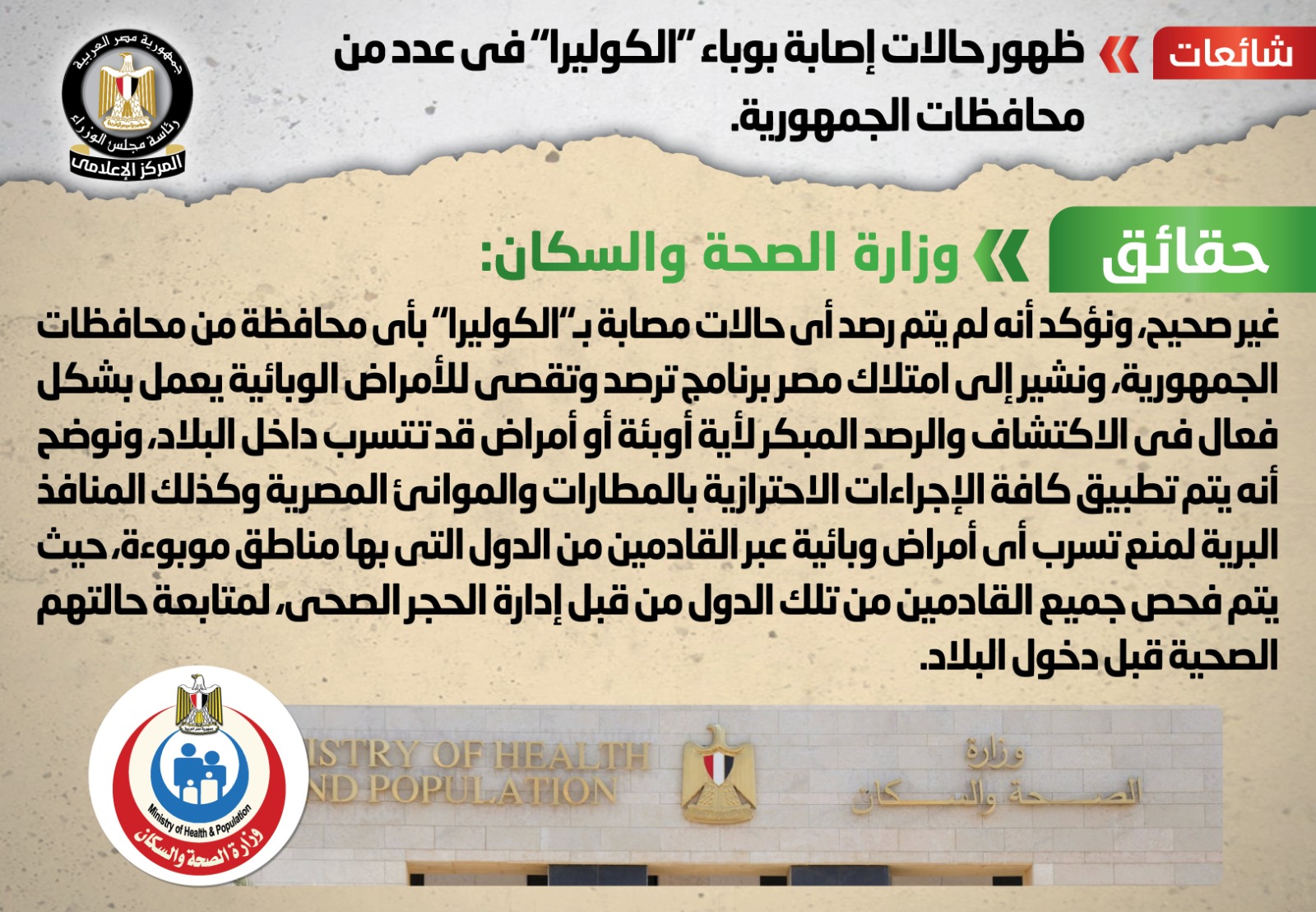 نفي المركز الإعلامي لمجلس الوزراء، ووزارة الصحة والسكان، ظهور حالات إصابة بوباء "الكوليرا" في أي من محافظات الجمهورية، وأنه لم يتم رصد أي حالات مصابة بـ"الكوليرا" بأي محافظة من محافظات الجمهورية.