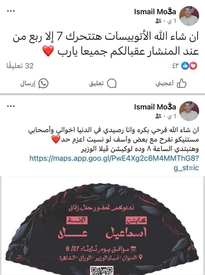 أهالى وأصدقاء الشاب شاركوا أخر منشور كتبه على صفحته على موقع التواصل الاجتماعى:"إن شاء الله فرحى بكره وأنا رصيدى فى الدنيا أخواتى وأصحابي مستنيكوا نفرح مع بعض و أسف لو نسيت أعزم حد".
