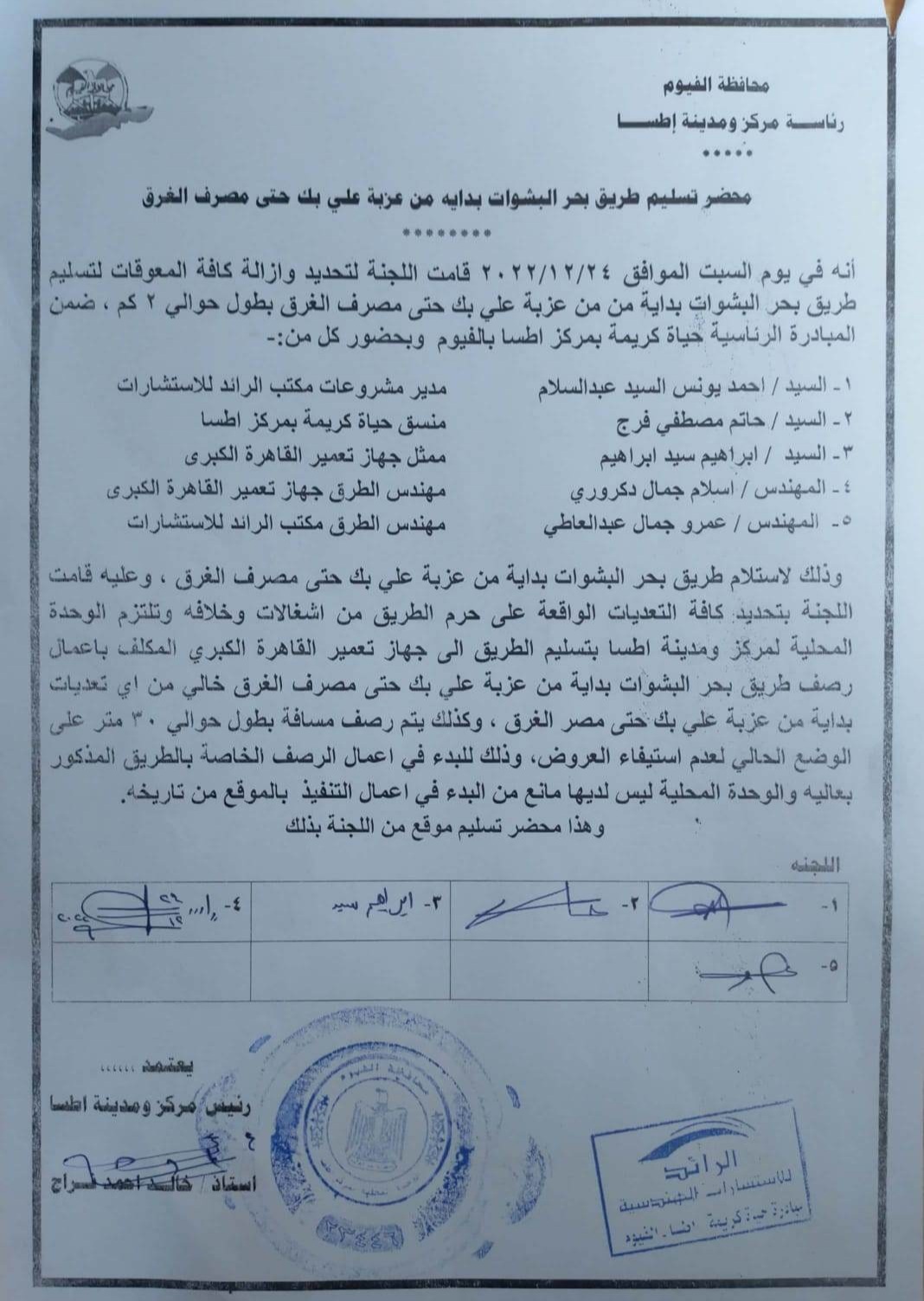 وأضاف طه إبراهيم حسن "محام" من أهالي عزبة شاكر الشرقية أن القرية تعاني من سوء حالة الطريق المؤدي إلينا بالإضافة إلى زيادة حالات التعدي عليه أثناء قيام الحفارات بأعمال التطهير وكذا من أصحاب الأراضي الزراعية الملاصقة للطريق، موضحا أنه تم معاينة وتسليم الطريق وعمل محضر التسليم بتاريخ 24 ديسمبر 2022 وتم ادراجه في خطة الرصف ضمن مبادرة حياة كريمة، تمهيدا لبدء أعمال الرصف ضمن المبادرة الرئاسية، وذلك ضمن الطرق التي شهدت نهو أعمال المرافق والبنية التحتية بها، ومنها طريق بحر البشوات بداية من عزبة علي بك حتى مصرف الغرق بطول 2 كم مرورا بالعزب المذكورة، إلا أن أعمال الرصف لم تبدأ حتى الآن، بالرغم من أهمية الطريق وحيويته وأصبح الطريق حائرا بين مديرية الطرق والوحدة المحلية لمركز ومدينة إطسا.