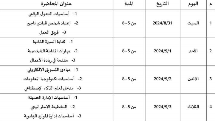 وأعلنت المديرية عن إطلاق البرنامج اعتبارًا من السبت المقبل الموافق 31 أغسطس الجارى، وحتى يوم الخميس 5 سبتمبر المقبل ، حيث سيتضمن البرنامج محاضرات يومية تبدأ من الساعة 5 عصراً حتى 8 مساءًا وذلك بقاعة ندوات استاد دمياط وفقًا لما هو موضح بالجدول الآتى: