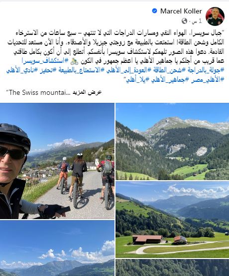 "جبال سويسرا، الهواء النقي ومسارات الدراجات التي لا تنتهي – سبع ساعات من الاسترخاء الكامل وشحن الطاقة، استمتعت بالطبيعة مع زوجتي جيزيلا والأصدقاء أنا الآن مستعد للتحديات القادمة، دعوا هذه الصور تلهمكم لاستكشاف سويسرا بأنفسكم أتطلع إلى أن أكون بكامل طاقتي عما قريب من أجلكم يا جماهير الأهلي يا أعظم جمهور في الكون".