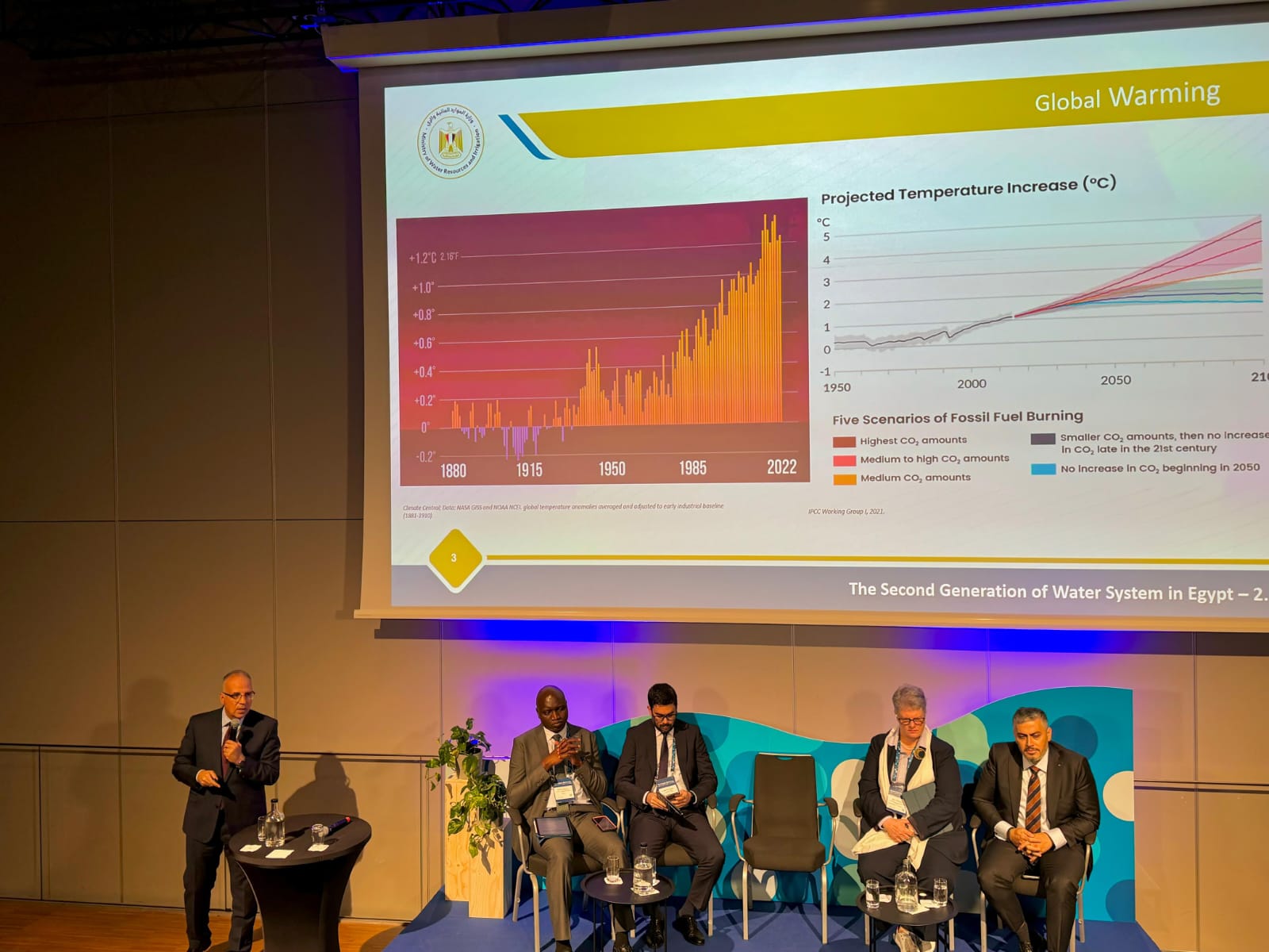 ولفت سويلم خلال مشاركته في جلسة "استراتيجيات مائية جديدة بمنطقة شمال أفريقيا والبحر المتوسط" والمنعقدة ضمن فعاليات الأسبوع العالمي للمياه فى ستكهولم، إلى أن مصر تُعد من أكثر الدول التي تواجه مثل هذه التحديات والمتمثلة في محدودية الموارد المائية، والزيادة السكانية والتغيرات المناخية التي تؤثر على مصر داخلياً مثل ارتفاع درجة الحرارة والسيول الومضية وارتفاع منسوب سطح البحر، أو خارجياً نتيجة للتأثير غير المتوقع للتغيرات المناخية على منابع النيل، في الوقت الذي تعتمد فيه مصر على نهر النيل بنسبة تصل إلى ٩٨% من مواردها المائية المتجددة ، وهو ما إنعكس على تراجع نصيب الفرد من المياه ليقترب من ٥٠٠ متر مكعب سنوياً والذى يمثل نصف قيمة خط الفقر المائى .