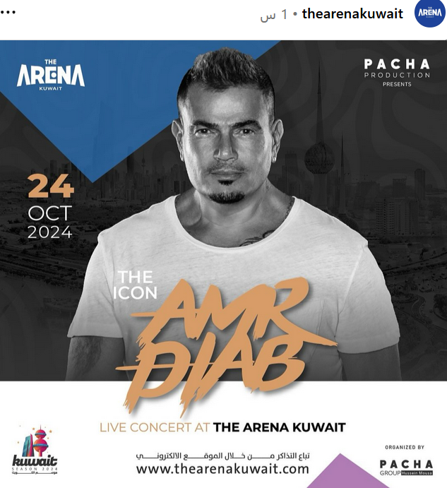 يقام حفل عمرو دياب في 24 أكتوبر المقبل، على مسرح الكويت أرينا، وتم طرح التذاكر عبر الموقع الإلكتروني الخاص بها.