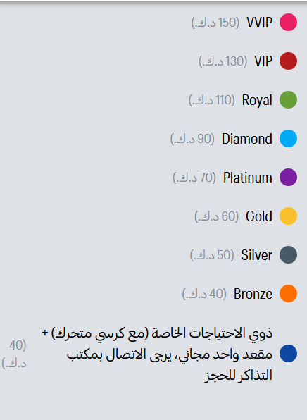 تراوحت أسعار التذاكر بين 40 - 150 دينار كويتي، ويتم حجزها إلكترونيًا حسب الفئة المخصصة لكل سعر والمكان المرغوب فيه