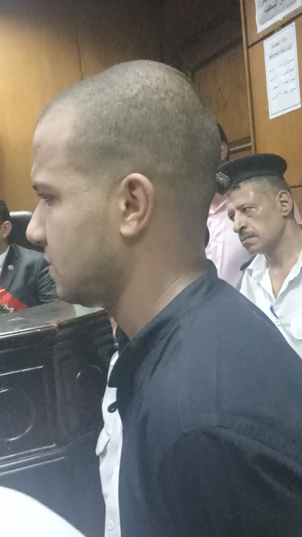 وظهر مطرب المهرجانات ذائع الصيت في قفص الاتهام بالبدلة الزرقاء، وكتب على ظهره "نزيل"، وبيده مصحفا، يقربه من صدره بين الفينة والأخرى، ويتمتم بآيات من القرآن الكريم.