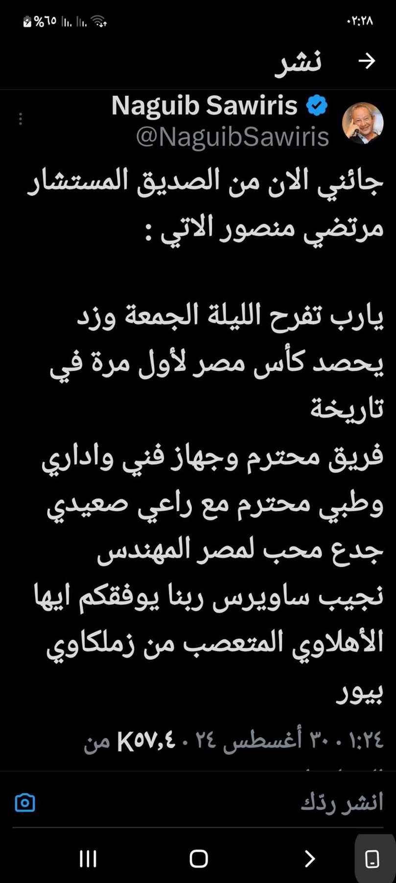 ونشر نجيب ساويرس نص رسالة مرتضى منصور على حسابه على موقع التواصل الاجتماعي اكس تحدث قائلا: “جائني الان من الصديق المستشار مرتضي منصور الاتي : يارب تفرح الليلة الجمعة وزد يحصد كأس مصر لأول مرة في تاريخه ”.