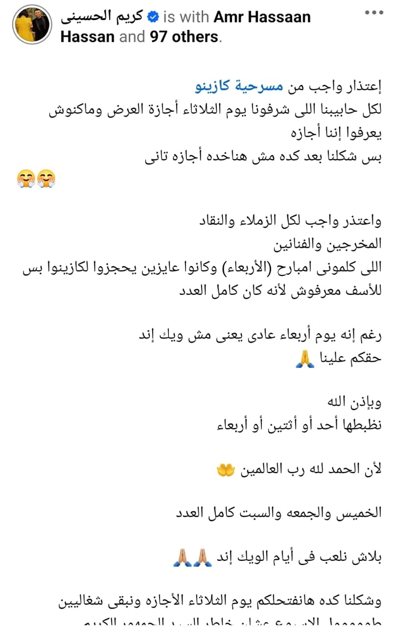 وكتب كريم الحسيني، عبر صفحته قائلًا : " إعتذار واجب من مسرحية كازينو.. لكل حابيبنا اللى شرفونا يوم الثلاثاء أجازة العرض ومكنوش يعرفوا إننا إجازة بس شكلنا بعد كده مش هناخده إجازه تاني".