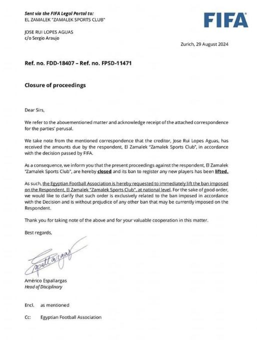 فيفا يخطر الزمالك برفع إيقاف القيد في قضية أجواش (مستند)
