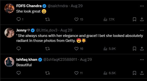 وسرعان ما تركت الجميع، واتجهت إليه وانحنت ووضعت يدها بلطف على كتفه وتحدثت معه، في لفتة إنسانية ما جعلتها حديث المهرجان ورواد مواقع التواصل الاجتماعي، وانتشرت الصور على نطاق واسع وانهالت التعليقات الإيجابية التي جاءت كالآتي، "إنسانة بمعني الكلمة"، "أنجلينا لديها مواقع إنسانية لا تعد"، "دائمًا تخطف الأنظار بإنسانيتها ما أجملها"، " تبهرنا دائمًا بأناقتها ونعمتها وإنسانيتها"، "ملكة جمال الأرض أنجلينا جولي"، "إنها تبدو جميلة كما هو الحال دائمًا"، "مواقفها الإنسانية جميلة كعادتها"، "أنجلينا تحمل معاني كثيرة من الإنسانية"، "اتمني أن يكون الجميع مثلها"، "أنجلينا المعني الحقيقي للكمال أشكرك على منحه كل الاحترام الذي يستحقه"، "لديها قلب جميل مثلها"، "فنانة القلوب والإنسانية".