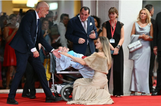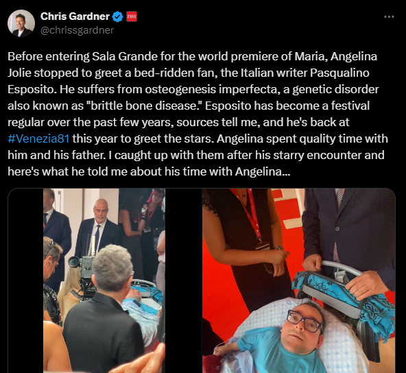 وصلت النجمة أنجلينا جولي مهرجان فينيسيا السينمائي بدورته الـ81، وذلك من أجل عرض فيلمها Maria الذي سيُشارك بالمسابقة الرسمية للمهرجان، وخلال سيرها على السجادة الحمراء والتقاط الصور، لمحت معجبًا بها مصابًا بمرض التصلب الجاني الضموري وممدد على سرير.