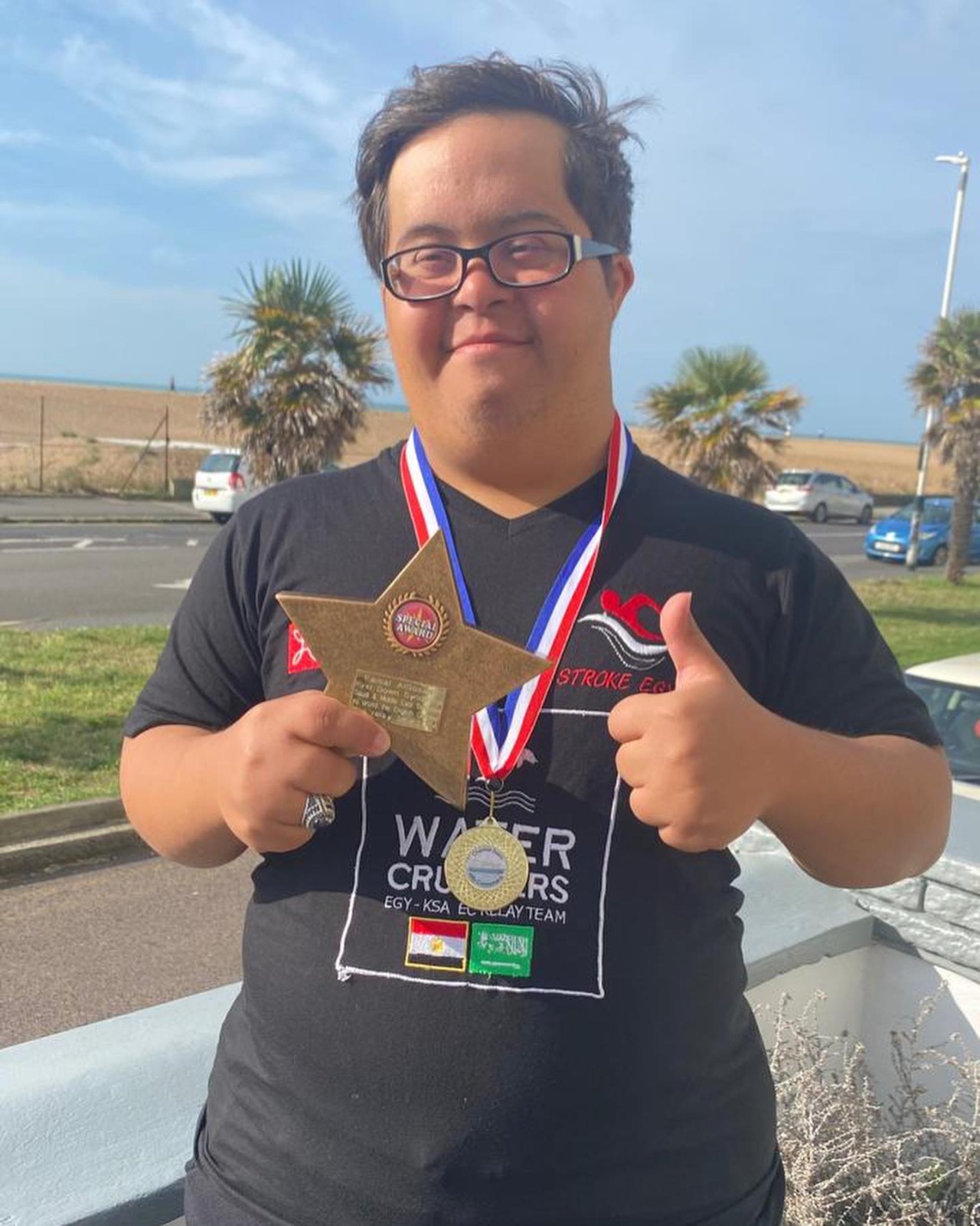 منح الاتحاد الانجليزي لعبور بحر المانش السباح السعودي ⁧‫فيصل القصيبي، درع أول سباح في السعودية والخليج العربي من ⁧‫متلازمة داون‬⁩ عبور بحر المانش.