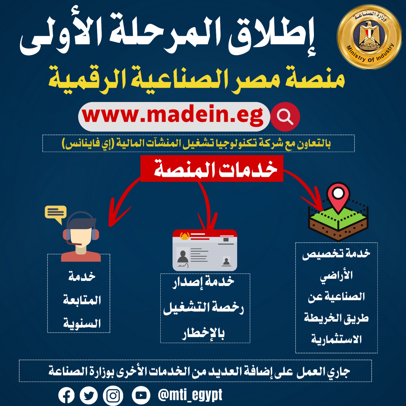 وأشار بيان الوزارة إلى أنه جاري العمل على الانتهاء من إطلاق خدمات إصدار تراخيص البناء واصدار السجل الصناعي، كما سيتم تباعًا إطلاق العديد من الخدمات الأخرى الخاصة بوزارة الصناعة والجهات التابعة لها في إصدارات مُتتالية للمنصة، و يمكن الدخول على منصة مصر الصناعية الرقمية من خلال الرابط التالي:  www.madein.eg