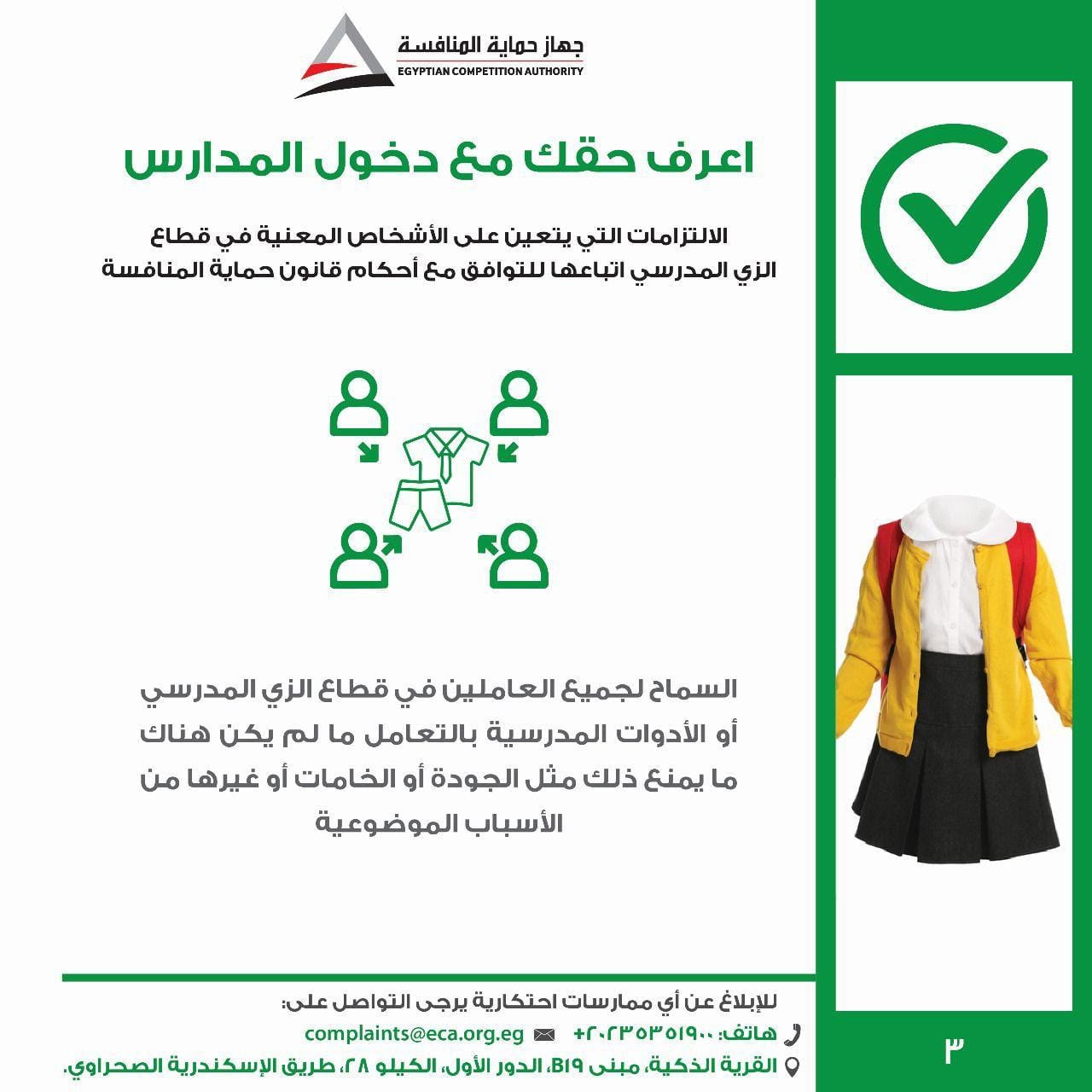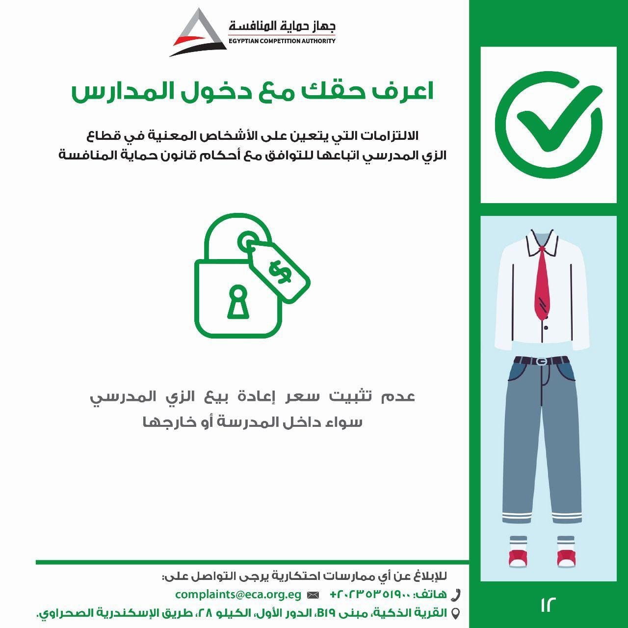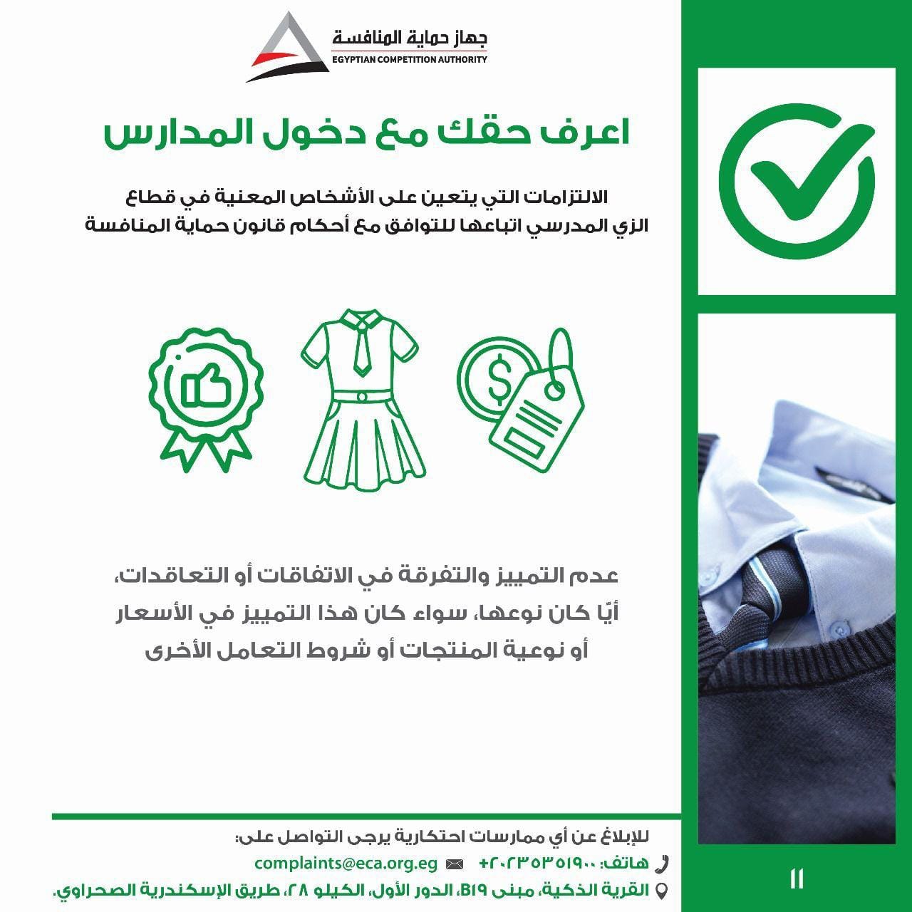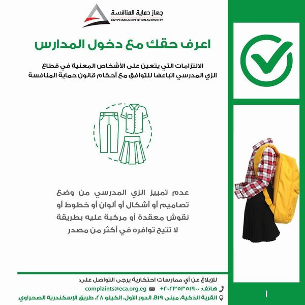 أطلق جهاز حماية المنافسة ومنع الممارسات الاحتكارية "حملة اعرف حقك مع دخول المدارس"، وذلك للتوعية بالممارسات الضارة بالمنافسة التي يجب تجنبها في سوق الزي المدرسي والأدوات المدرسية، والالتزامات الواجبة على المدارس والمصنعين والموردين في هذا القطاع، وتوعية الطلاب وأولياء الأمور بحقوقهم وكيفية التواصل مع الجهاز في حالة مواجهتهم لأية مخالفة قد يترتب عليها زيادة في الأسعار الخاصة بالزي المدرسي والأدوات المدرسية.