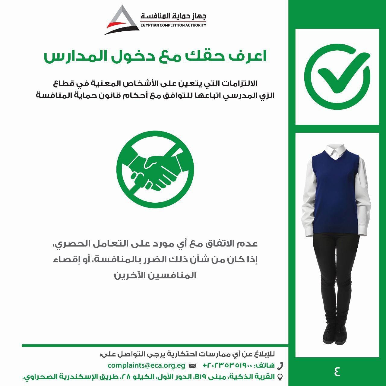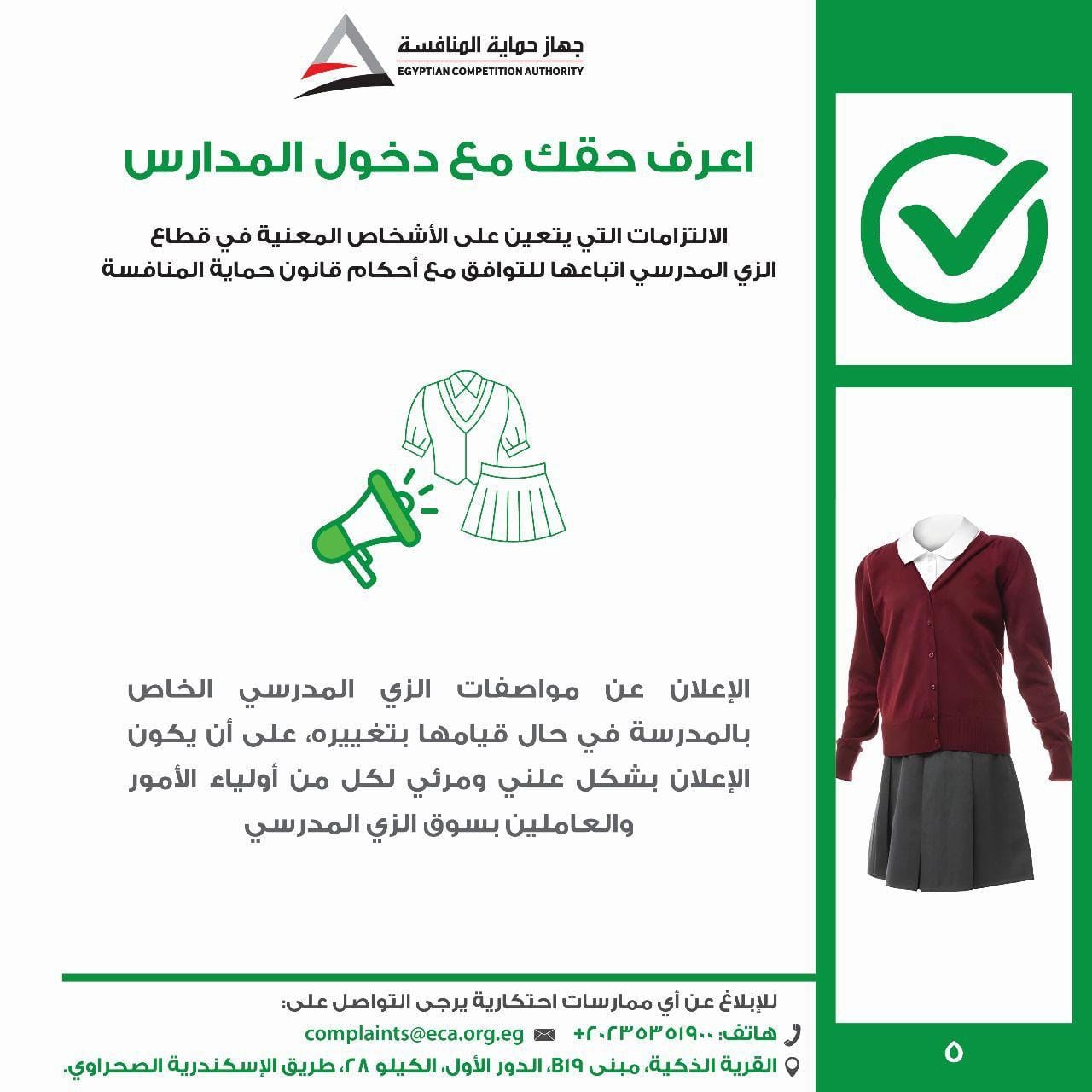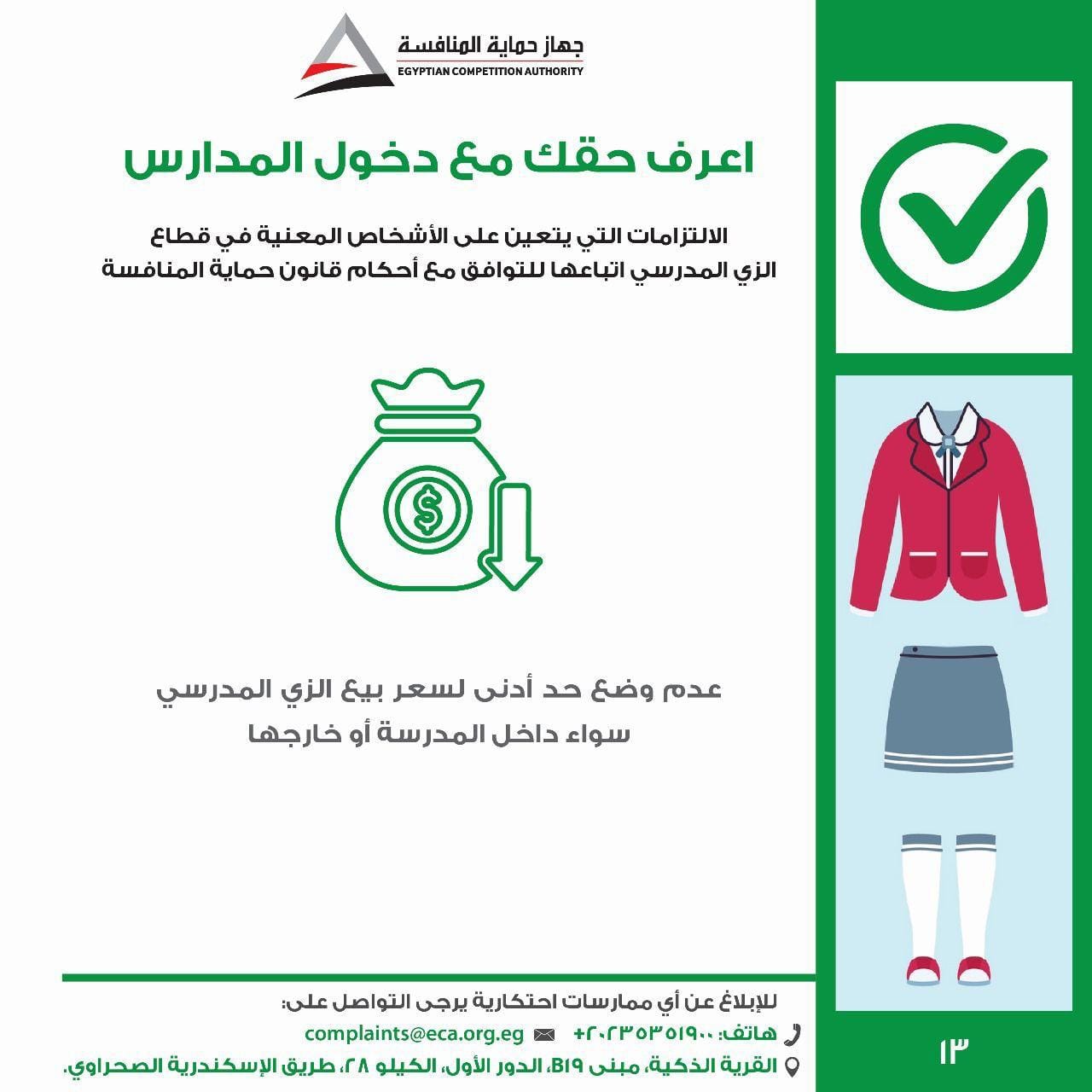 أطلق جهاز حماية المنافسة ومنع الممارسات الاحتكارية "حملة اعرف حقك مع دخول المدارس"، وذلك للتوعية بالممارسات الضارة بالمنافسة التي يجب تجنبها في سوق الزي المدرسي والأدوات المدرسية، والالتزامات الواجبة على المدارس والمصنعين والموردين في هذا القطاع، وتوعية الطلاب وأولياء الأمور بحقوقهم وكيفية التواصل مع الجهاز في حالة مواجهتهم لأية مخالفة قد يترتب عليها زيادة في الأسعار الخاصة بالزي المدرسي والأدوات المدرسية.