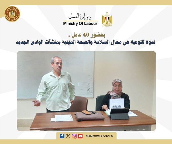 نظمت مديرية العمل بمحافظة الوادى الجديد، من خلال إدارة السلامة والصحة المهنية ومكتب السلامة والصحة المهنية بالخارجة، ندوة للتوعية في مجال السلامة والصحة المهنية، بحضور 40 من العاملين بـ مستشفى الخارجة التخصصي، تحت عنوان "سلامتك تهمنا" حول مفهوم السلامة والصحة المهنية، وتحليل وتقييم المخاطر في بيئة العمل، وخطة الطوارئ وكيفية إعدادها، وكيفية تشكيل لجان السلامة والصحة المهنية بالمنشآت، وكيفية استخدام وسائل الحماية المدنية (طفايات الحريق) ومواجهة الأزمات والكوارث وطرق مجابهة المخاطر، وكيفية الوقاية والتعامل مع النفايات الخطرة، وعرض تأثير التغيرات المناخية على بيئة العمل، تحت إشراف الإدارة المركزية للسلامة والصحة المهنية وتأمين بيئة العمل بالوزارة ، وذلك ضمن جهود المديرية وأجهزتها التابعة لنشر ثقافة السلامة والصحة المهنية بين العاملين بالمنشآت الصحية بالمحافظة.