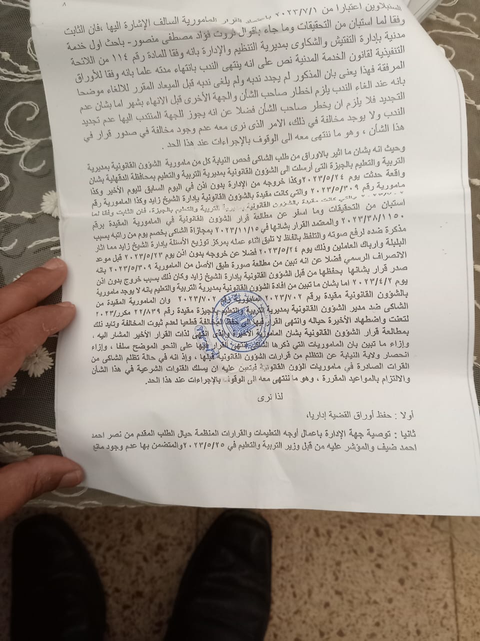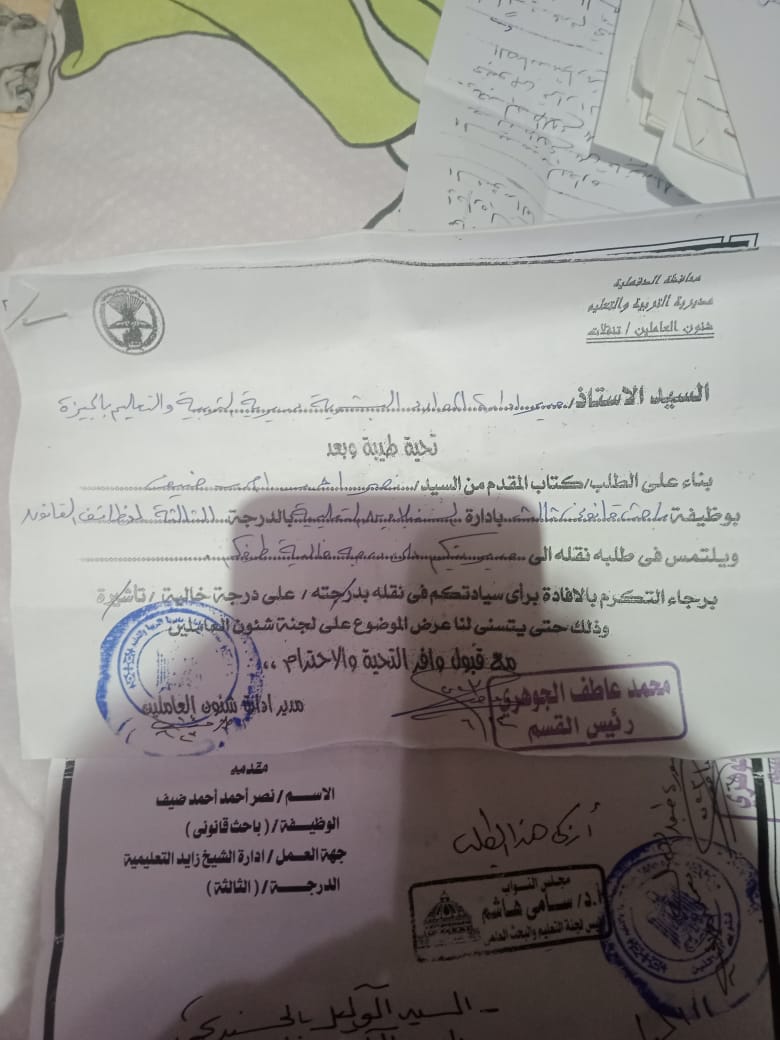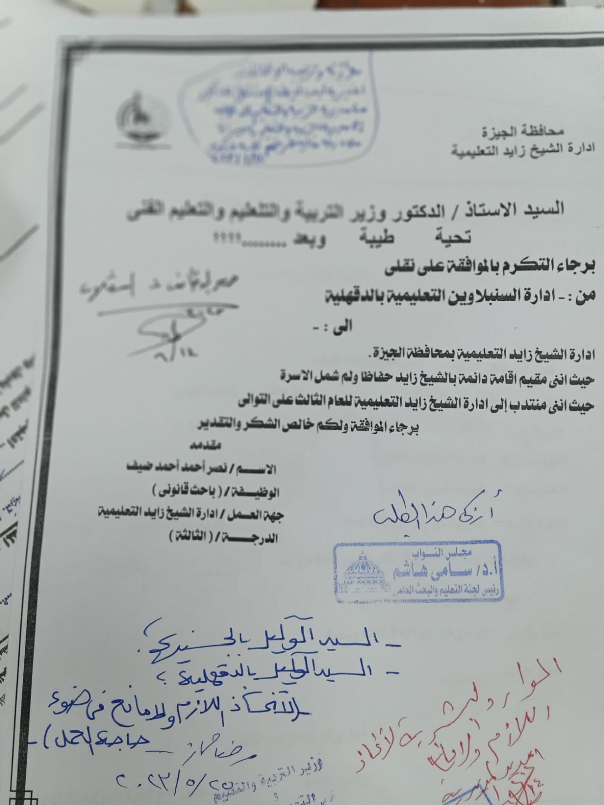 يستغيث نصر أحمد أحمد ضيف، الباحث القانونى بإدارة الشيخ زايد التعليمية سابقا وحاليا بالسنبلاوين، من مدير مديرية التربية والتعليم بالجيزة أشرف سلومة المكلف بعدم تنفيذ قرار وزير التربية والتعليم بنقله إلى إدارة الشيخ زايد التعليمية المشفوع بتوصيات النيابة الإدارية برقم 1375 بسبب شكواى ضده بمخالفات مالية وإدارية وعملية رشوة ومعى الأدلة والمستندات التى تكشف وتوضح هذه المخالفات الجسيمة، حيث ذكر أشرف سلومة مدير مديرية التربية والتعليم بالجيزة، عند مواجهتى به وتقديم الأوراق لنقلى إلى الإدارة رد قائلا: "أنها عزبتى"