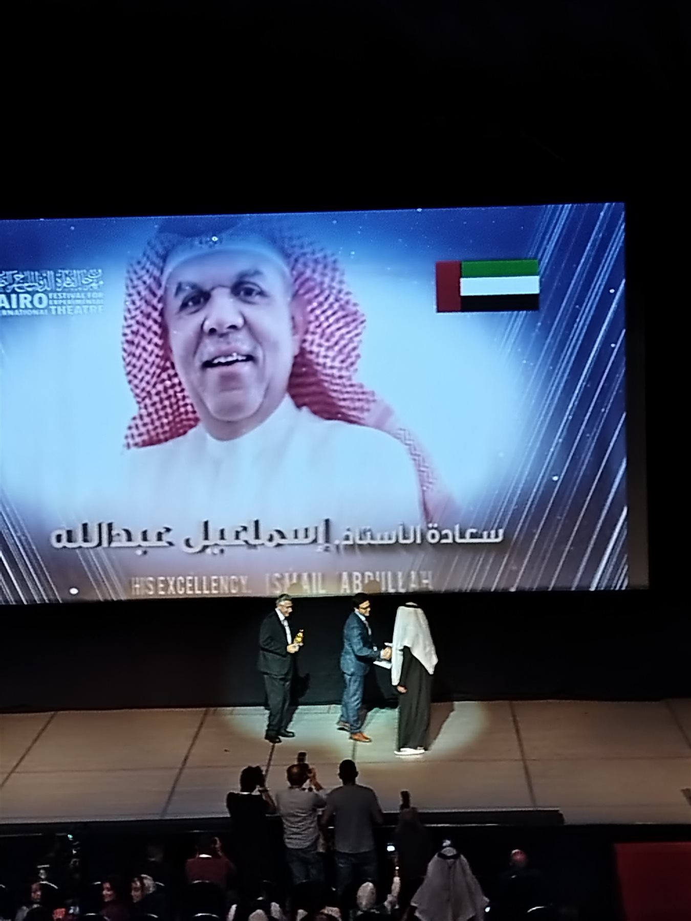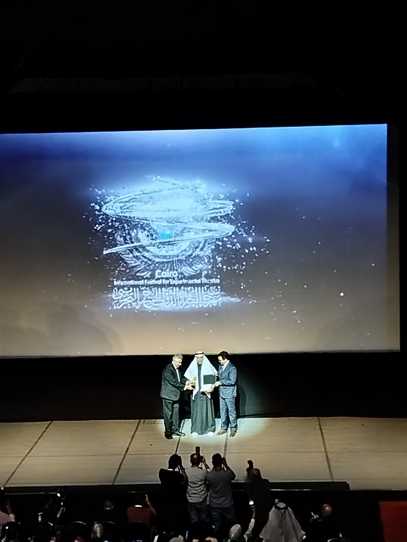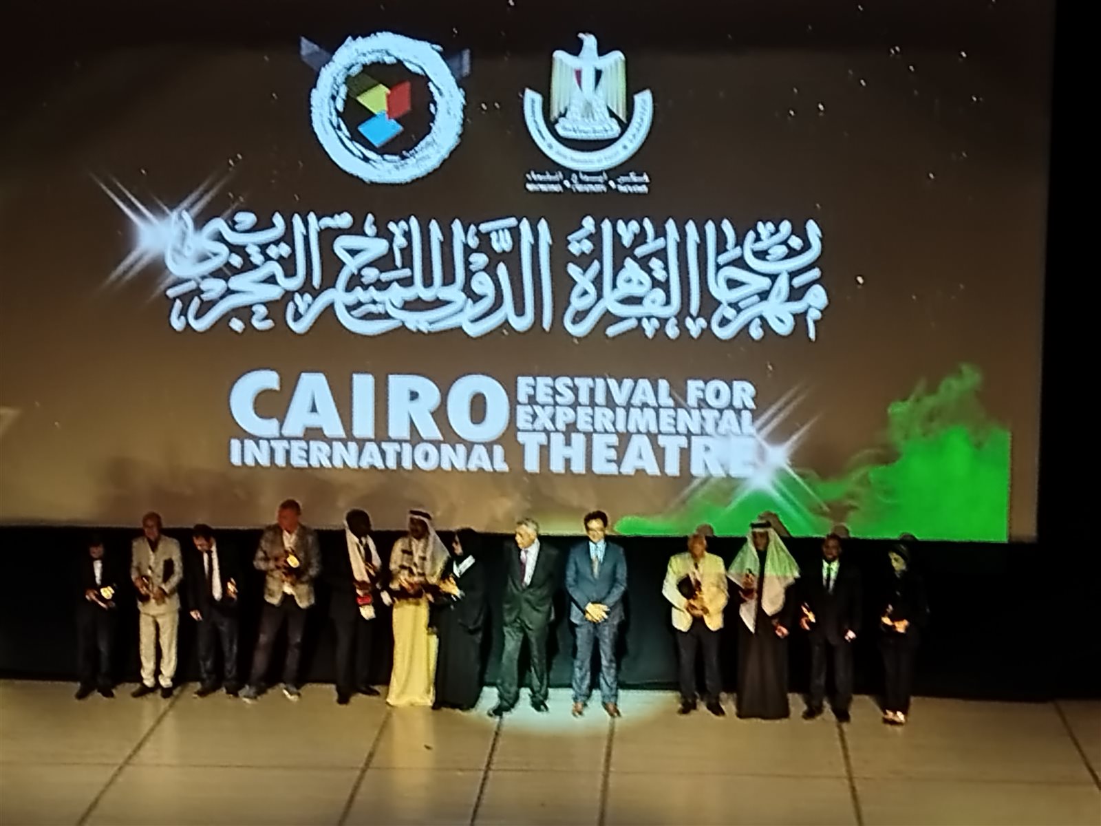 وهما : "الفنان القدير د. محمد عبد المعطي، ومهندس الديكور د. صبحي السيد، والناقد المصري فتحي العشري ، ومن (لبنان)  يكرم المهرجان الفنان القدير وليد عوني، ومن (مملكة البحرين) يكرم الفنان والناقد يوسف الحمدان، ومن (العراق) يتم تكريم د. ميمون الخالدي، ومن (اليونان) يُكرم الفنان ساڤاس پاتساليدس، ومن (الإمارات ) يُكرم الكاتب محمد سعيد الظنحاني، ومن (السعودية) يتم تكريم الكاتبة والناقدة الكبيرة ملحة عبدالله، ومن (استوانيا ) يُكرم الفنان مارت ميوسي، وشخصية العام الكاتب الكبير إسماعيل عبد الله رئيس الهيئة العربية للمسرح وهذه الجائزة مستحدثة هذا العام.
