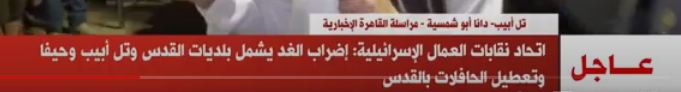 أعلن اتحاد نقابات العمال الإسرائيليين، عن إضراب غدا يشمل بلديات تل أبيب القدس وحيفا وتعطيل الحافلات في القدس، كما أعلنت نقابة الأطباء الإسرائيليين الانضمام للاضراب مع استمرارأقسام الطواريء في العمل، بحسب ما ذكرت فضائية القاهرة الإخبارية في نبأ عاجل لها