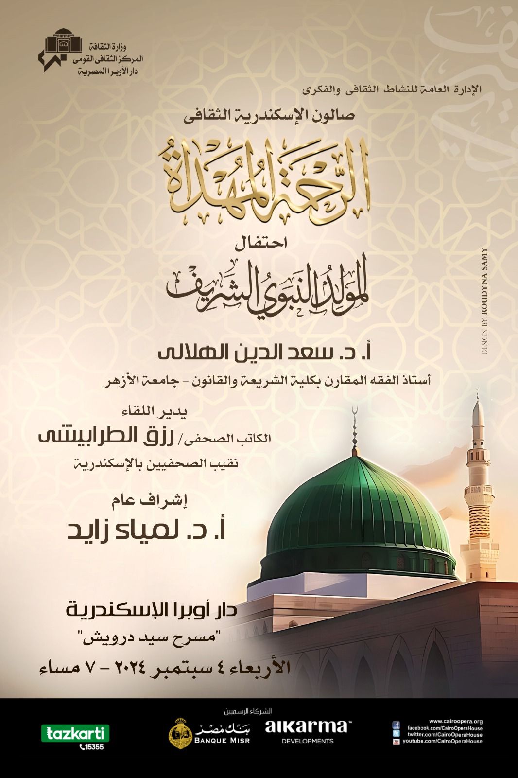 في إطار فعاليات وزارة الثقافه للإحتفال بالمناسبات الدينية المختلفة  تنظم دار الأوبرا المصرية برئاسة الدكتورة لمياء زايد فى إفتتاح الموسم الجديد للنشاط الثقافى والفكرى  صالون أوبرا الإسكندرية الثقافى و الذي يقام تحت عنوان (الرحمة المهداة ) إحتفالاً بالمولد النبوى الشريف .
