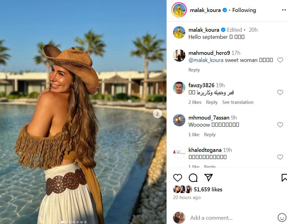 اعتادت الفنانة الشابة ملك قورة على مشاركة متابعيها بأحدث إطلالاتها خلال استجمامها بعطلتها الصيفية في أحدى الشواطئ الساحلية عبر حسابها الشخصي بموقع الإنستجرام.