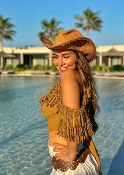 وزينت خصلات شعرها بقبعة الكاو بوي ووضعت مكياجًا ناعمًا مرتكزًا على الألوان الترابية مع تحديد عينيها بالكحل والماسكرا السوداء ولون البينك في الشفاه.