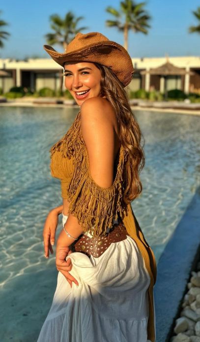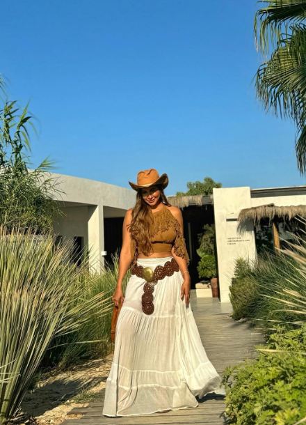 وتملك ملك قورة ذوقا خاصا جعلها تتنوع في إطلالاتها التي تتسم بالبساطة والاختلاف، حيث ارتدت توب مميز بصيحة الكاو بوي بشراشيب ناعمة ونسقت عليه جيب بيضاء وعليه حزام جلد بدوائر كبيرة متشابكة.