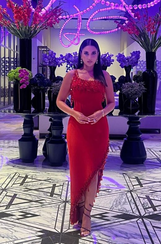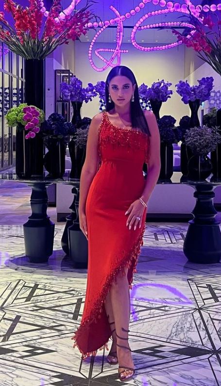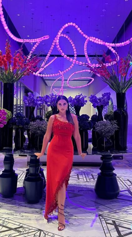 وتزينت ببعض المجوهرات المرصعة بحبات الألماس لتزيد من فخامة إطلالتها فهي تعلم جيدًا كيف تصبح ملكة أو عارضة أزياء مميزة وسط الجميع.