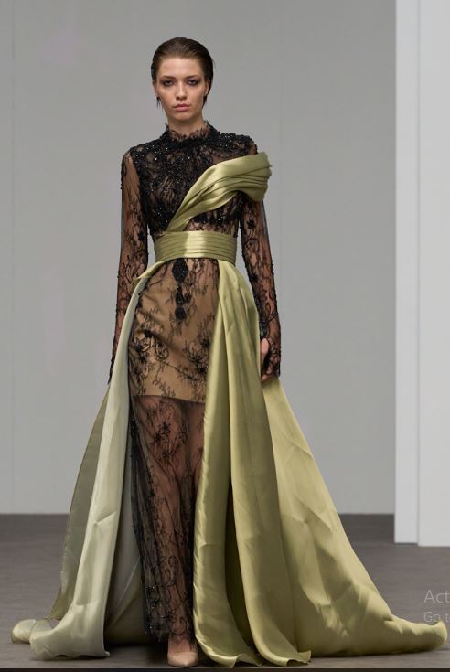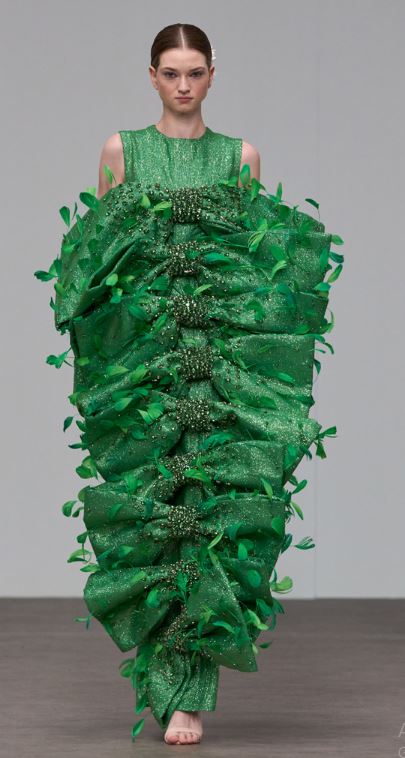 وجاءت النتيجة مرضيه بتقديم تصاميم جمعت بين فخامة الكوتور وجنون الفن، أحببنا منها الفستان الأخضر الطويل المغطى من الأمام بالفيونكات الكبيرة المطرزة والمصمم من دون أكمام وياقة دائرية مغلقة.
