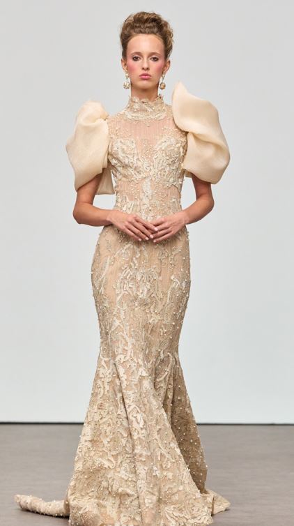 كان الفستان الدانتيل الطويل المصمم بأكمام منتفخة وياقة عالية من أجمل القطع التي زينت مدرج عرض اليوم الثاني من أسبوع دبي للموضة، لونه البيج الفاتح وقصته المعانقة للجسم على شكل ذيل السمكة سيجعله من القطع المفضلة للقصيرات في ربيع 2025، وننصحهن بتنسيقه مع صندل من لونه نفسه بكعب عالٍ؛ للحصول على مزيد من الطول.