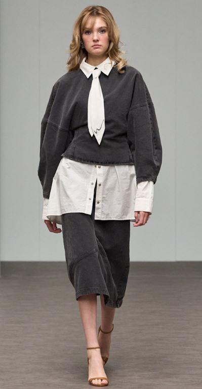 ومزجت ماركة وينسانتو بين الغرابة والجرأة لتقدم عرض مميز بمجموعتها التى تتناسب مع صاحبات الذوق المتمرد، في المجمل جاء العرض ليغازل ذوق الشابات ويلبي احتياجاتهن من الصيحات الآنية التي تصمد لموسم أو اثنين على الأكثر، ولكنه لم ينسَ الأساسيات؛ فالمجموعة التي استوحت بعض تصاميمها من الأزياء المدرسية ركزت على الألوان الحيادية والرصينة، فكان الأسود الملكي الأبرز على منصة العرض، من جهتنا أحببنا الإطلالة الدنيم المكونة من تنورة ميدي رمادية وسويت شيرت من اللون نفسه والخامة، اللذين نُسِّقا مع قميص أبيض طويل مزين برباط عنق.