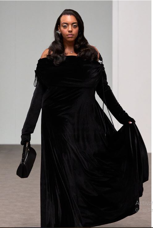 أبرزت الماركة الشهيرة رغبتها في تقديم أزياء تناسب جميع النساء من خلال الظهور الأنيق للعارضة الممتلئة، التي تألقت بفستان أسود طويل مصمم من المخمل ومميز بقصته المنسدلة على الجسم، وقد ازدان ببروش صغير على إحدى الكتفين، ونُسِّق مع حقيبة سوداء متوسطة الحجم.