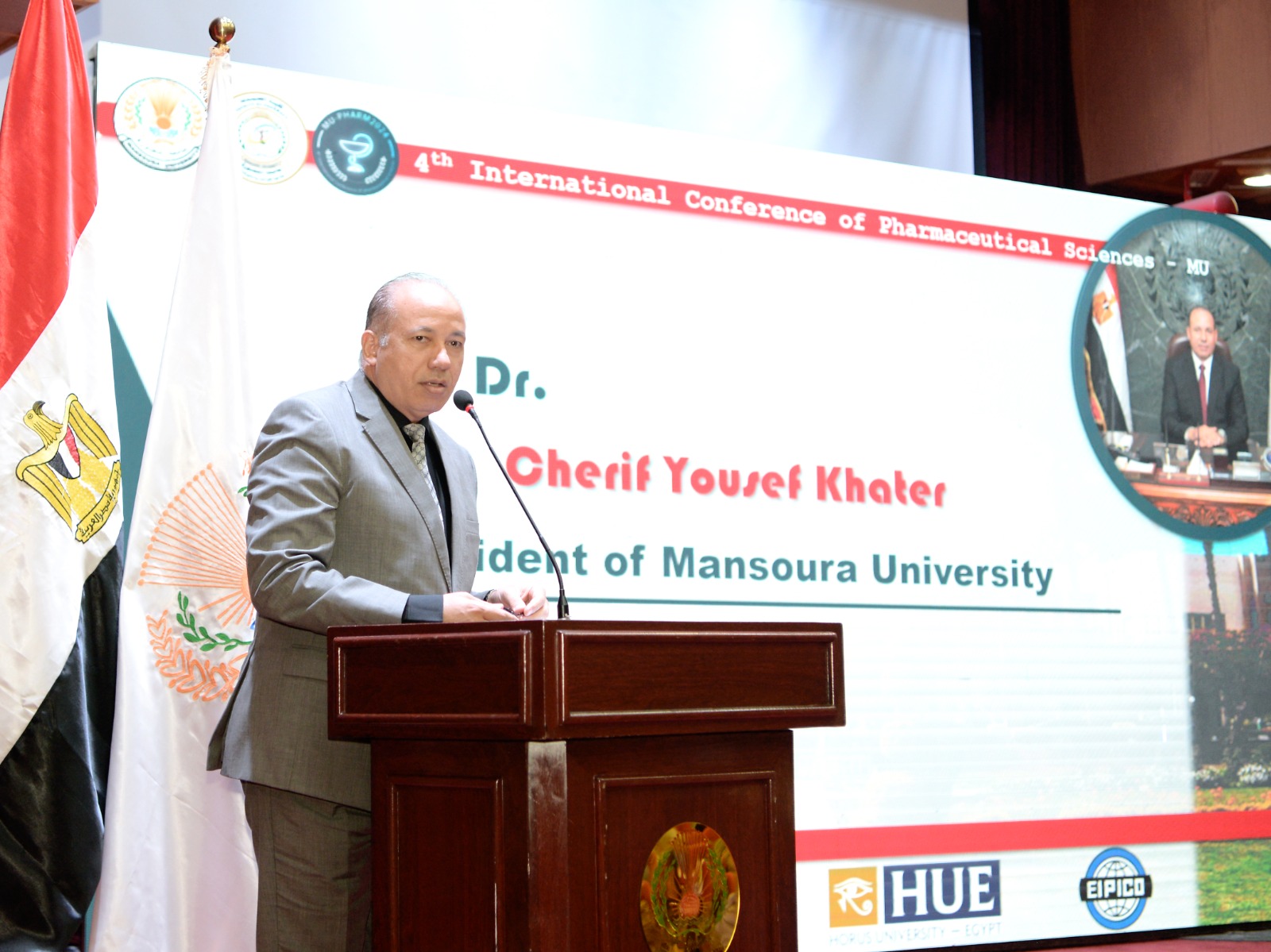 بحضور الأستاذ الدكتور شريف يوسف خاطر، رئيس جامعة المنصورة، الأستاذ الدكتور محمد عبد العظيم، نائب رئيس الجامعة لشئون خدمة المجتمع وتنمية البيئة، الأستاذ الدكتور طارق غلوش، نائب رئيس الجامعة لشئون الدراسات العليا والبحوث، الأستاذ الدكتور ماجدة نصر – نائب رئيس جامعة حورس، الأستاذ الدكتور أشرف سويلم – نائب رئيس الجامعة الأسبق، الأستاذ الدكتور حسين خضير - وكيل لجنة الصحة بمجلس الشيوخ، الأستاذ الدكتور منال عيد – عميد كلية الصيدلة،وكيلا كلية الصيدلة و نائبا رئيس المؤتمر: الأستاذ الدكتور خالد بشير ، الأستاذ الدكتور هاني القناوى ، سكرتيرا المؤتمر: الدكتورة يسرا الفار والدكتورة ميرهان محسن.