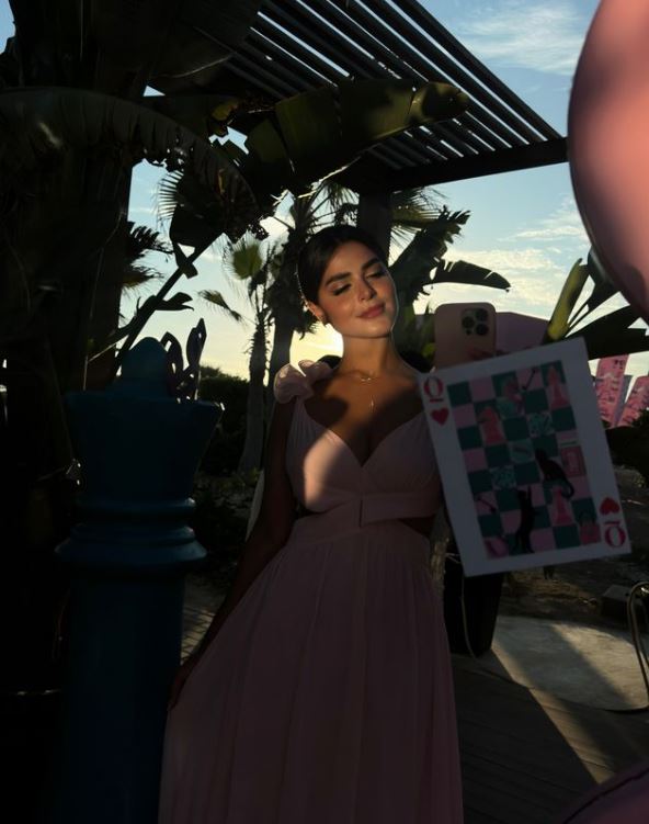 وسيطرت البساطة والرقي على تسريحة شعرها ووضعت مكياجًا ناعمًا مرتكزًا على ألوان النود مع تحديد عينيها بالكحل والماسكرا السوداء ولون البينك في الشفاه.