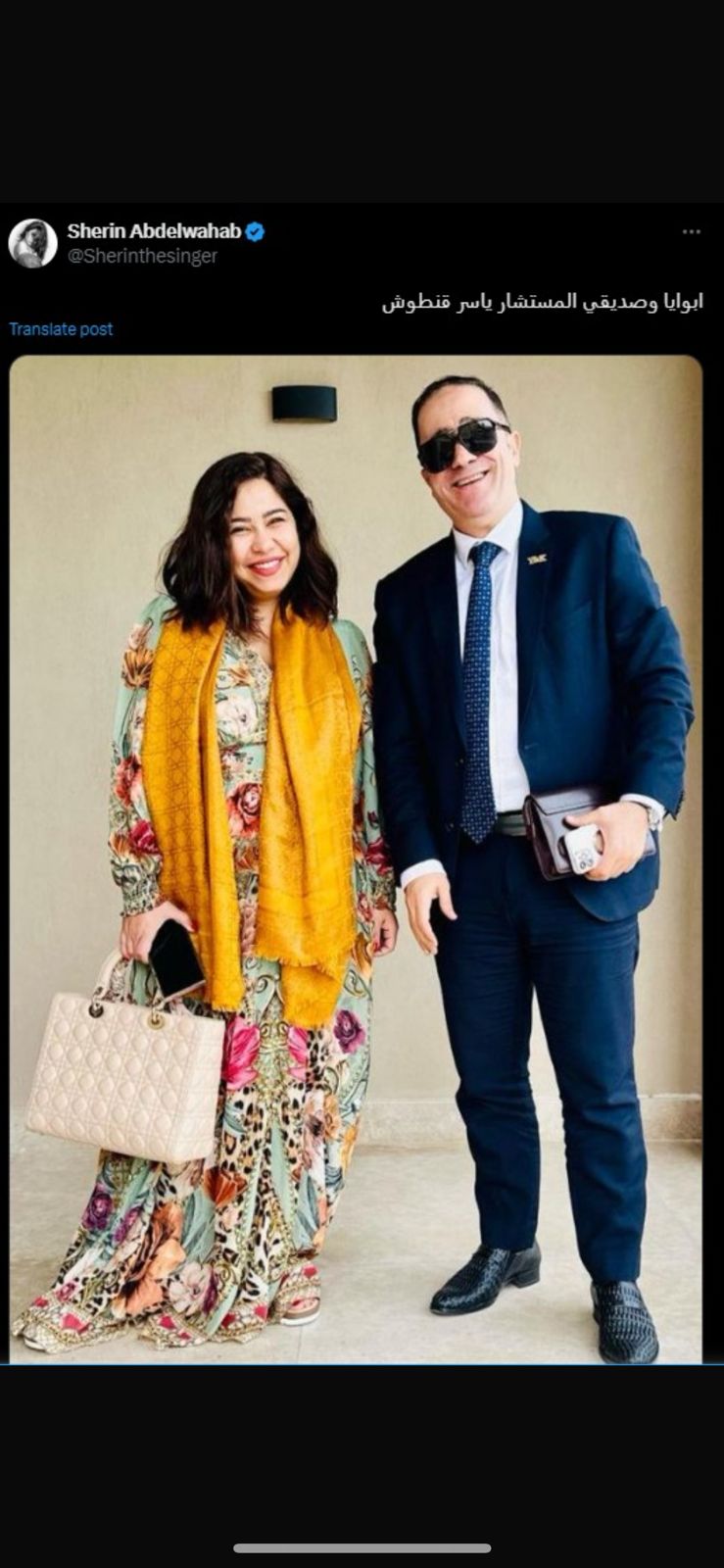 يذكر أن الفنانة شيرين عبدالوهاب قد نشرت منذ قليل صورة جمعتها بمحاميها الخاص ياسر قنطوش، وعلقت عليها قائلة: أبويا وصديقي المستشار ياسر قنطوش.