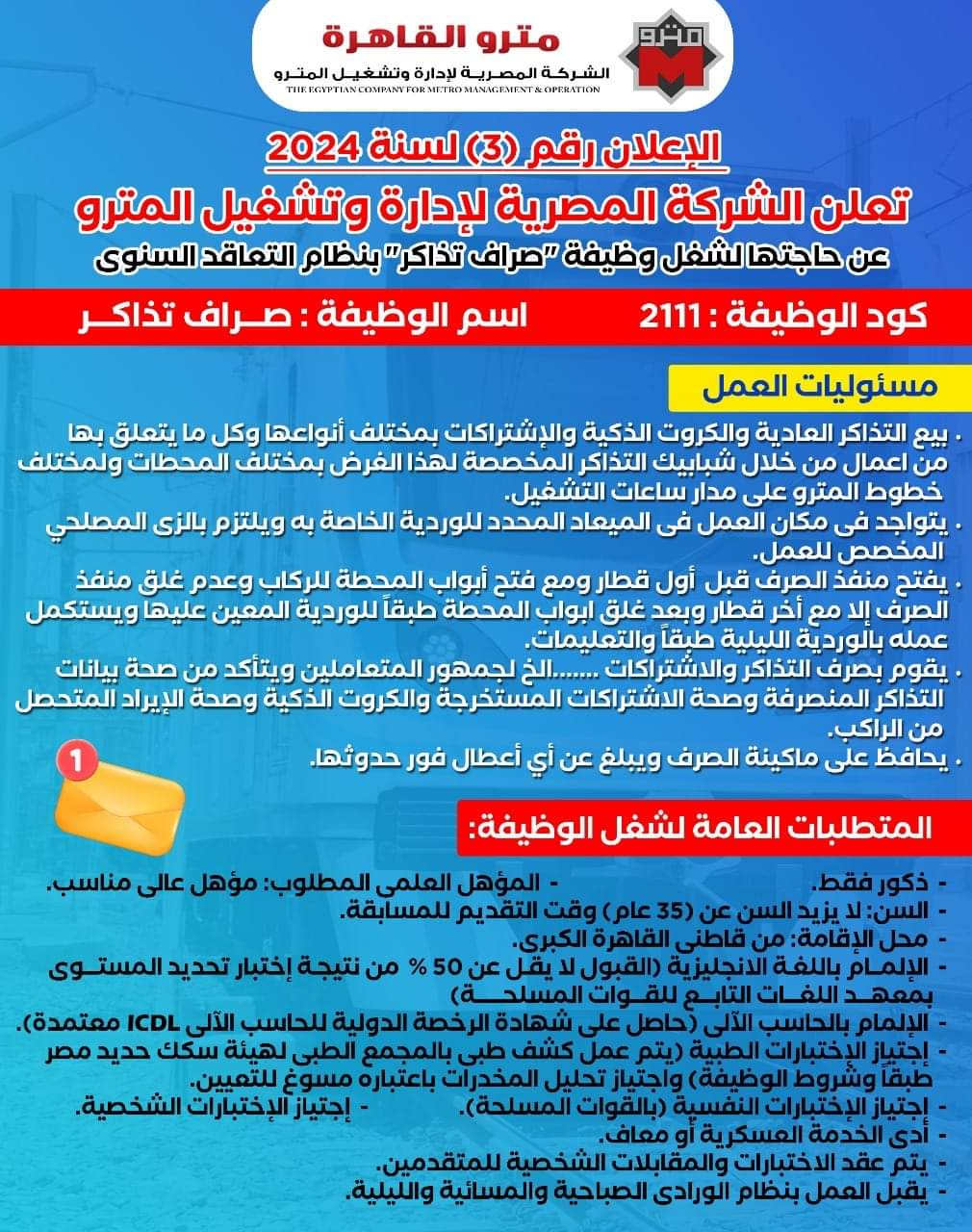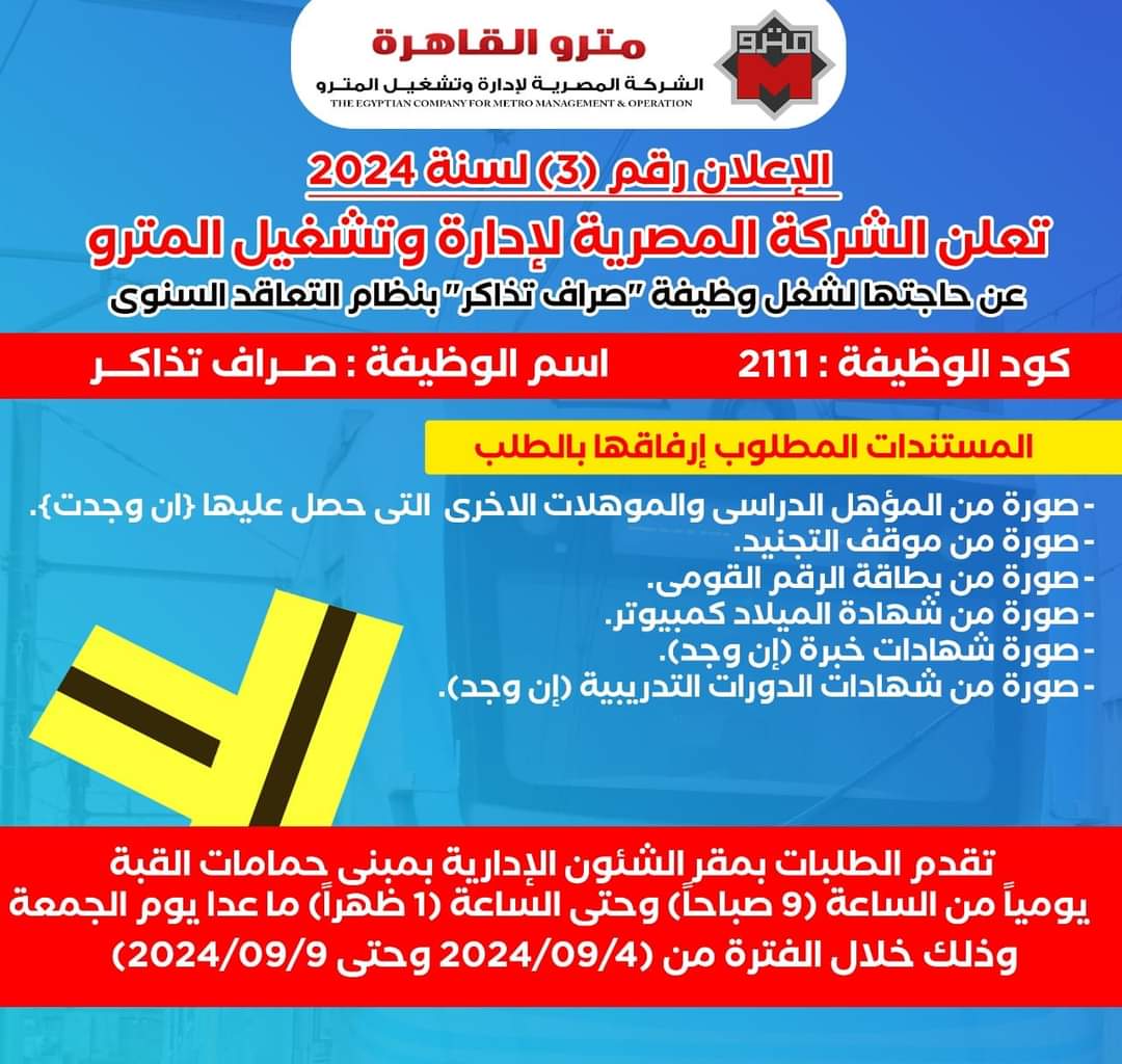 اعلنت الشركة المصرية لإدارة وتشغيل المترو عن حاجتها لشغل وظيفة "صراف تذاكر" بنظام التعاقد السنوى - كود الوظيفة: 2111 .