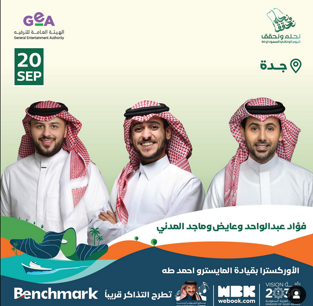 تأتي فعاليات اليوم الوطني السعودية بليلة خليجية ثلاثية مع كل من “فؤاد عبد الواحد، عايض يوسف، ماجد المدني”، وذلك في 20 سبتمبر الجاري على مسرح عبادي الجوهر أرينا بمدينة جدة.