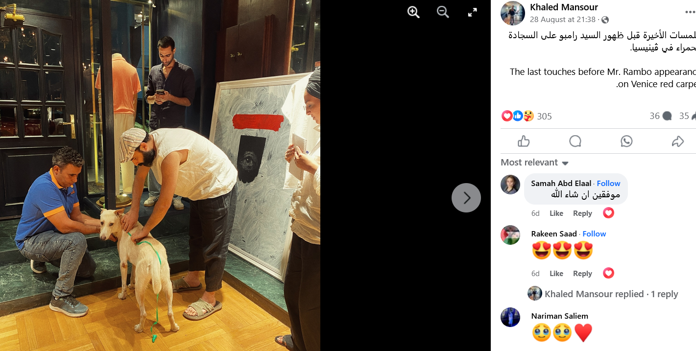 ونشر المخرج خالد منصور صورة للكلب البلدي المصري اثناء التجهيزات الأخيرة للسفر برفقة أبطال الفيلم وصناعه للمشاركة في الدورة 81 لمهرجان البندقية السينمائي الدولي، وعلق على الصورة عبر حسابه الخاص على الفيس بوك قائلا: اللمسات الأخيرة قبل ظهور السيد رامبو على السجادة الحمراء في ڤينيسيا.