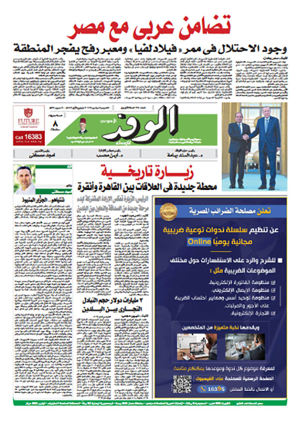 تنشر جريدة الوفد في عددها الصادر، غدًا الخميس، الكثير من الموضوعات والتقارير الإخبارية المهمة، أبرزها: "تضامن عربي مع مصر".