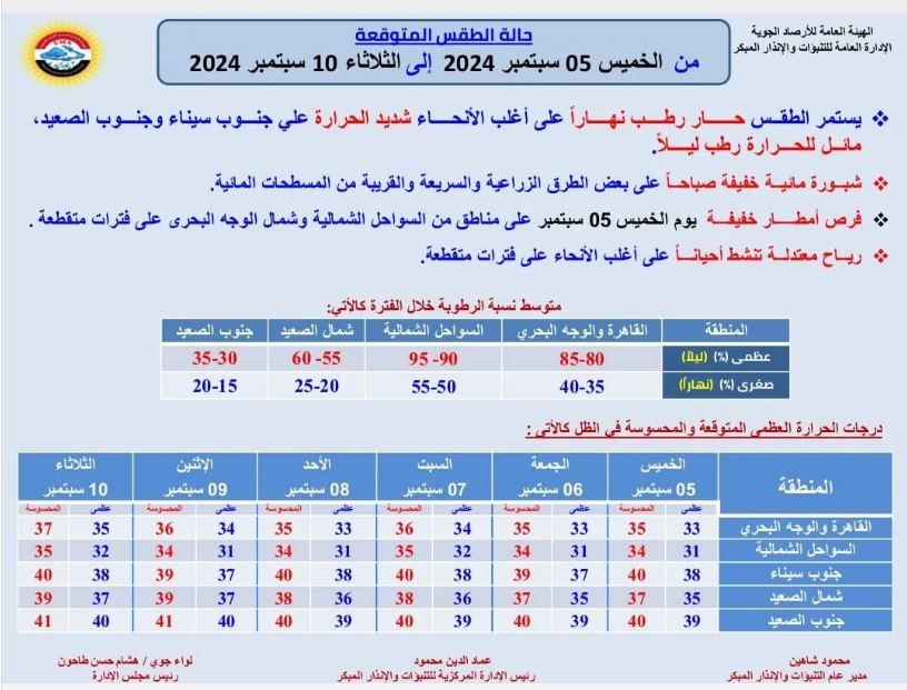 أكدت هيئة الأرصاد الجوية أن الطقس خلال النهار سيكون حارًا ورطبًا في القاهرة الكبرى والوجه البحري وشمال الصعيد، بينما سيكون حارًا ورطبًا أيضًا على السواحل الشمالية، وشديد الحرارة ورطبًا في جنوب سيناء وجنوب الصعيد.