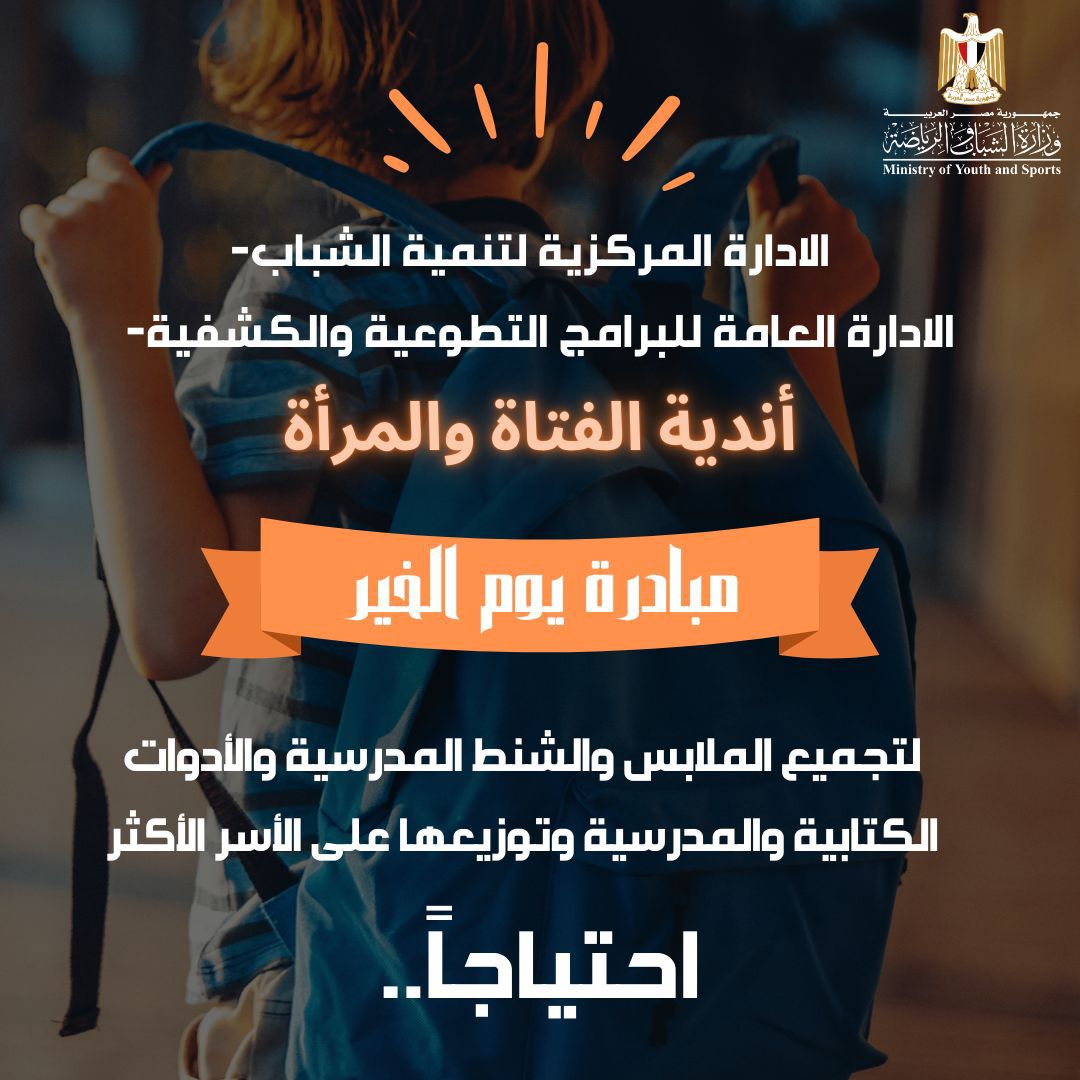 بدأت وزارة الشباب والرياضة، برئاسة الدكتور أشرف صبحى، استعداداتها لإطلاق مبادرة "يوم الخير"، والخاصة ببدء العام الدراسي وتجهيز المستلزمات الدراسية للأسر الأكثر احتياجًا، وذلك في مرحلتها السابعة، بأندية الفتاة والمرأة بمراكز الشباب على مستوى محافظات الجمهورية.