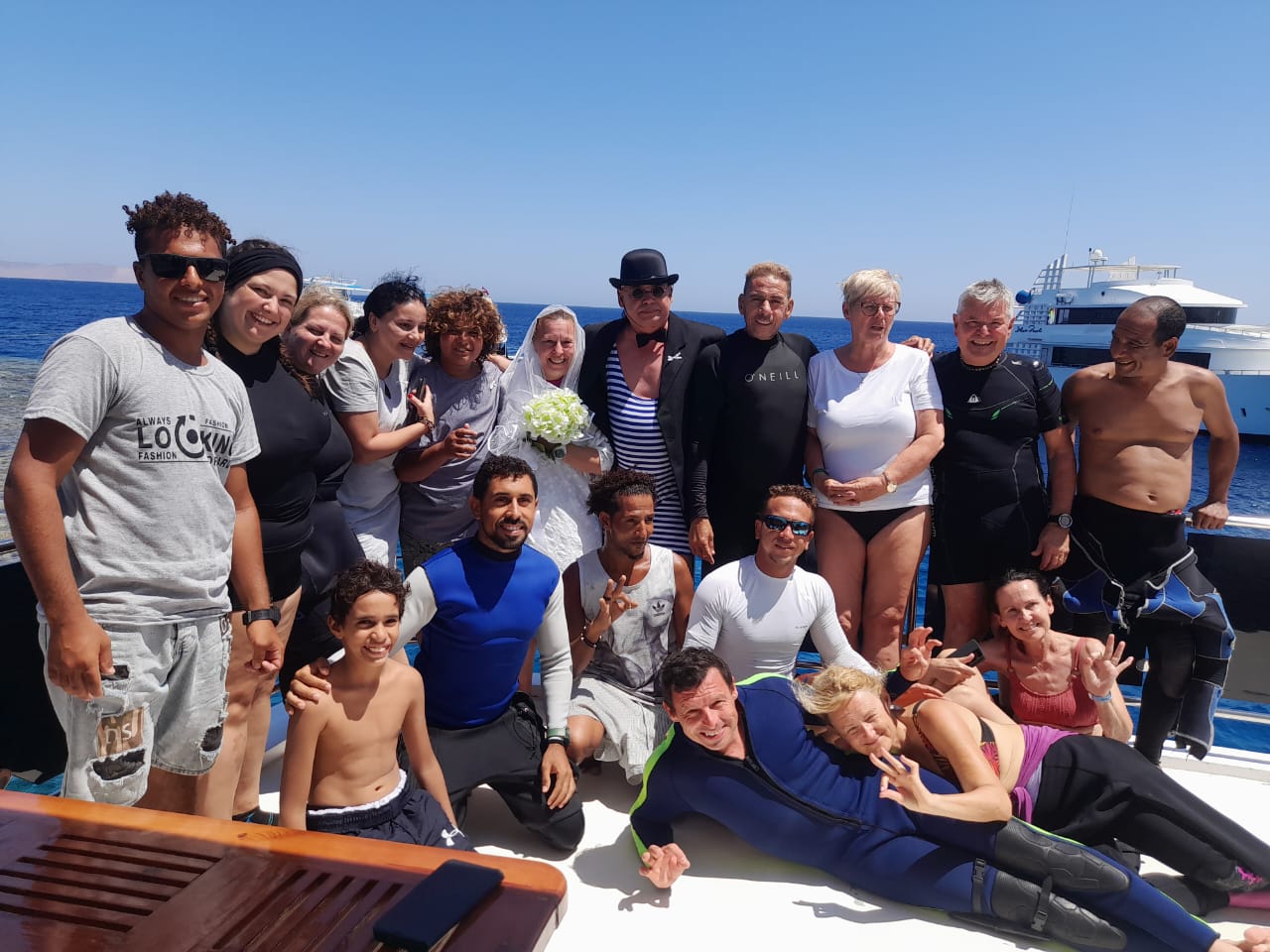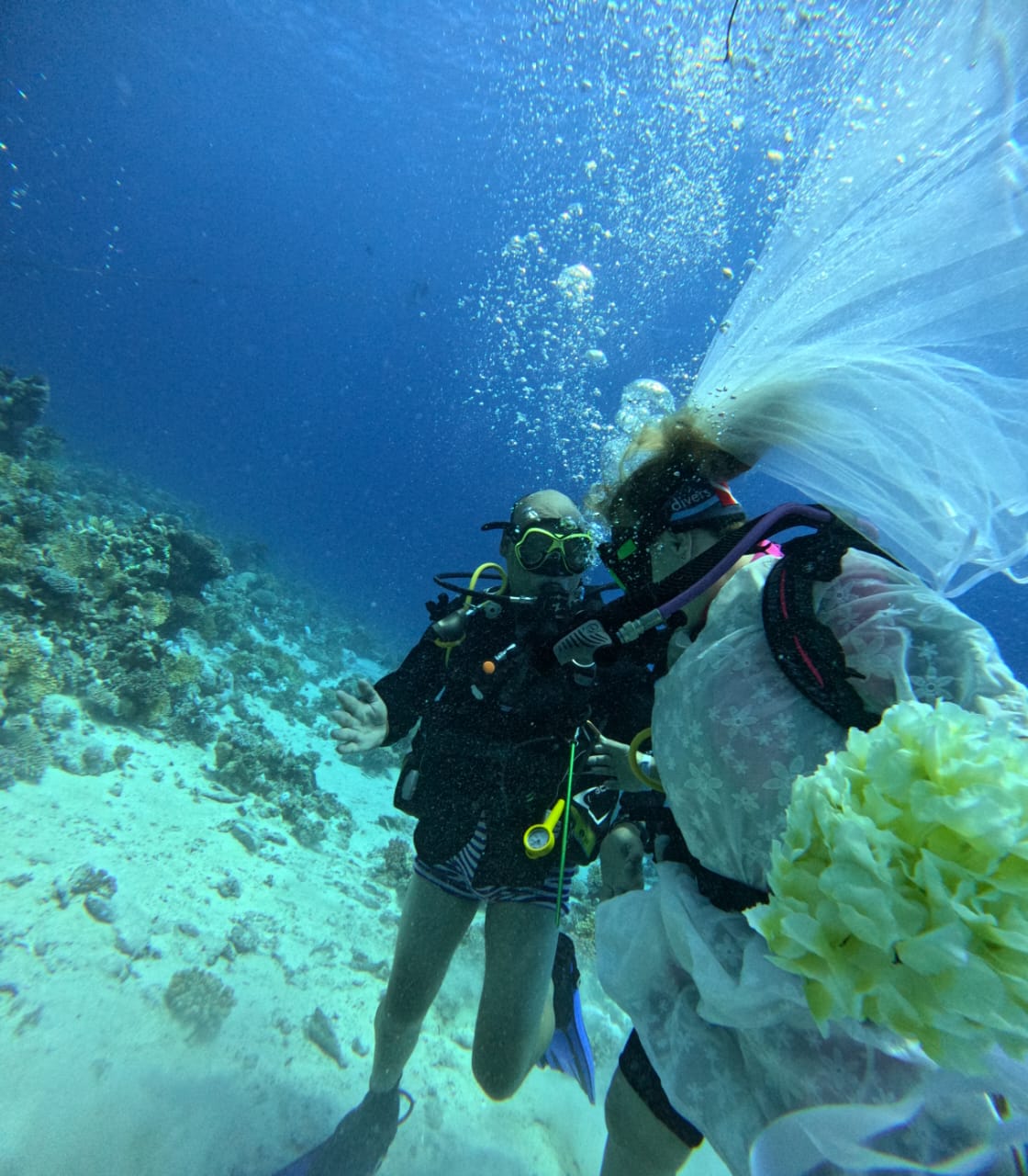 قررا سائحان فى العقد السادس من العمر إتمام مراسم الزفاف تحت الماء في أعماق البحر بالغردقة مرتدين فستان الزفاف وبدلة الفرح وأدوات الغطس ليقوم السائح التشيكي يورسلوف بتقديم خاتم الزواج لمحبوبته السائحة بولينا في جو من السعاده والبهجة وسط عدد من السياح والغطاسين تحت الماء.