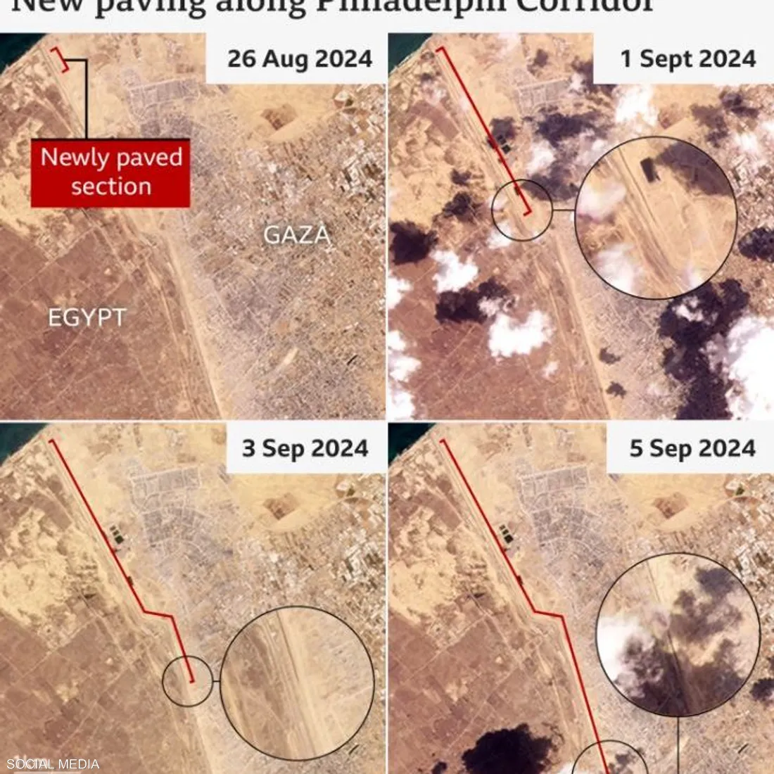 كشفت صورٌ التقطتها الأقمار الصناعية قيام القوات الإسرائيلية بأعمال بناء وأنشاء طريق رئيسي في قطاع غزة على طول "محور فيلادلفيا"، الذي يفصل قطاع غزة عن مصر.