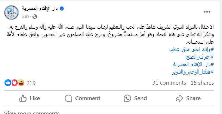 وقد نشرت دار الإفتاء المصرية عبر صفحتها الرسمية على الموقع الإلكتروني الفيسبوك موضحه أن الاحتفال بالمولد النبوي الشريف شاهدٌ على الحب والتعظيم لجناب سيدنا النبي صلى الله عليه وآله وسلم والفرح به، وشكرٌ لله تعالى على هذه النعمة.