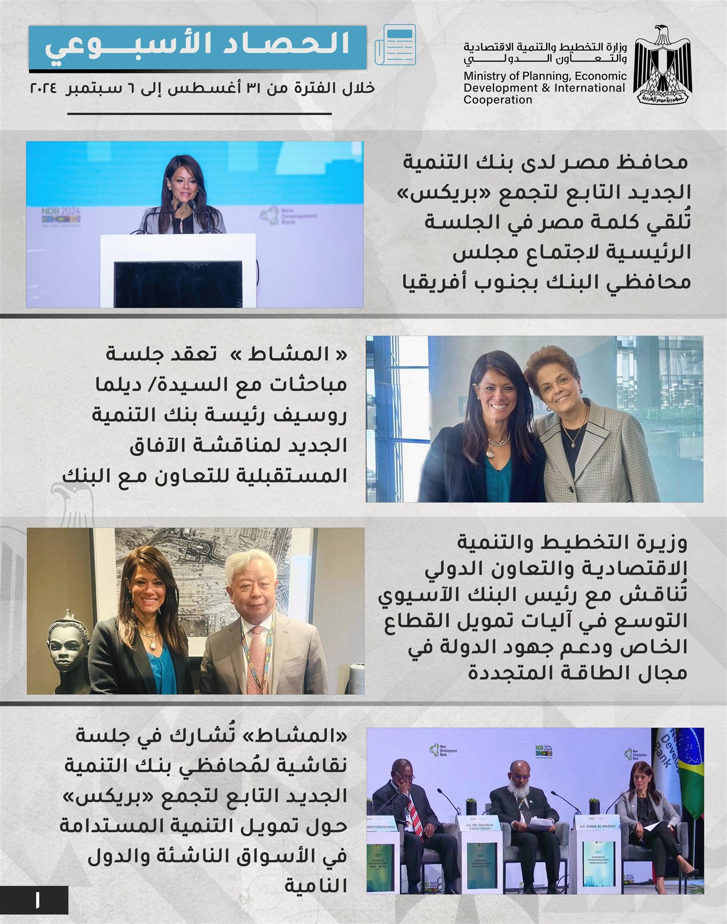 أعلنت وزارة التخطيط والتنمية الاقتصادية والتعاون الدولي الحصاد الأسبوعي حول أبرز أنشطة وفعاليات الوزارة، خلال الأسبوع المنتهي.