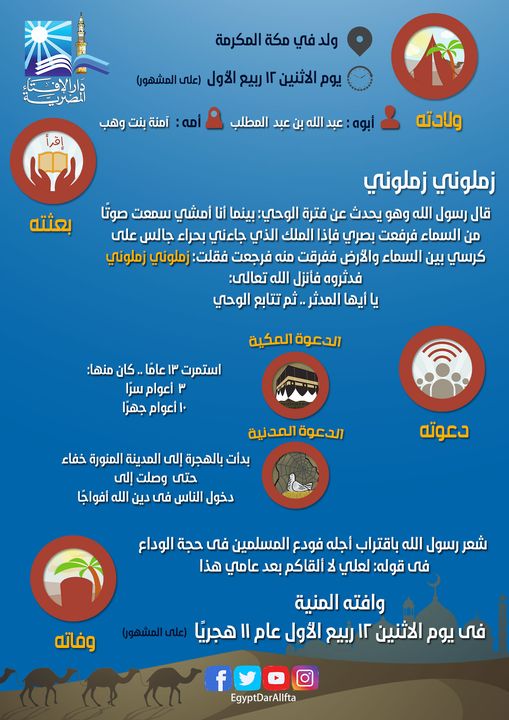 ومع اقتراب مولد النبي في الخامس عشر من سبتمبر الجاري نشرت دار الإفتاء المصرية في سليلة احتفائها بذكرى سيد الخلق محمد صلى الله عليه وسلم معلومات أساسية على كل مسلم أن يعلمها عن رسوله الكريم.